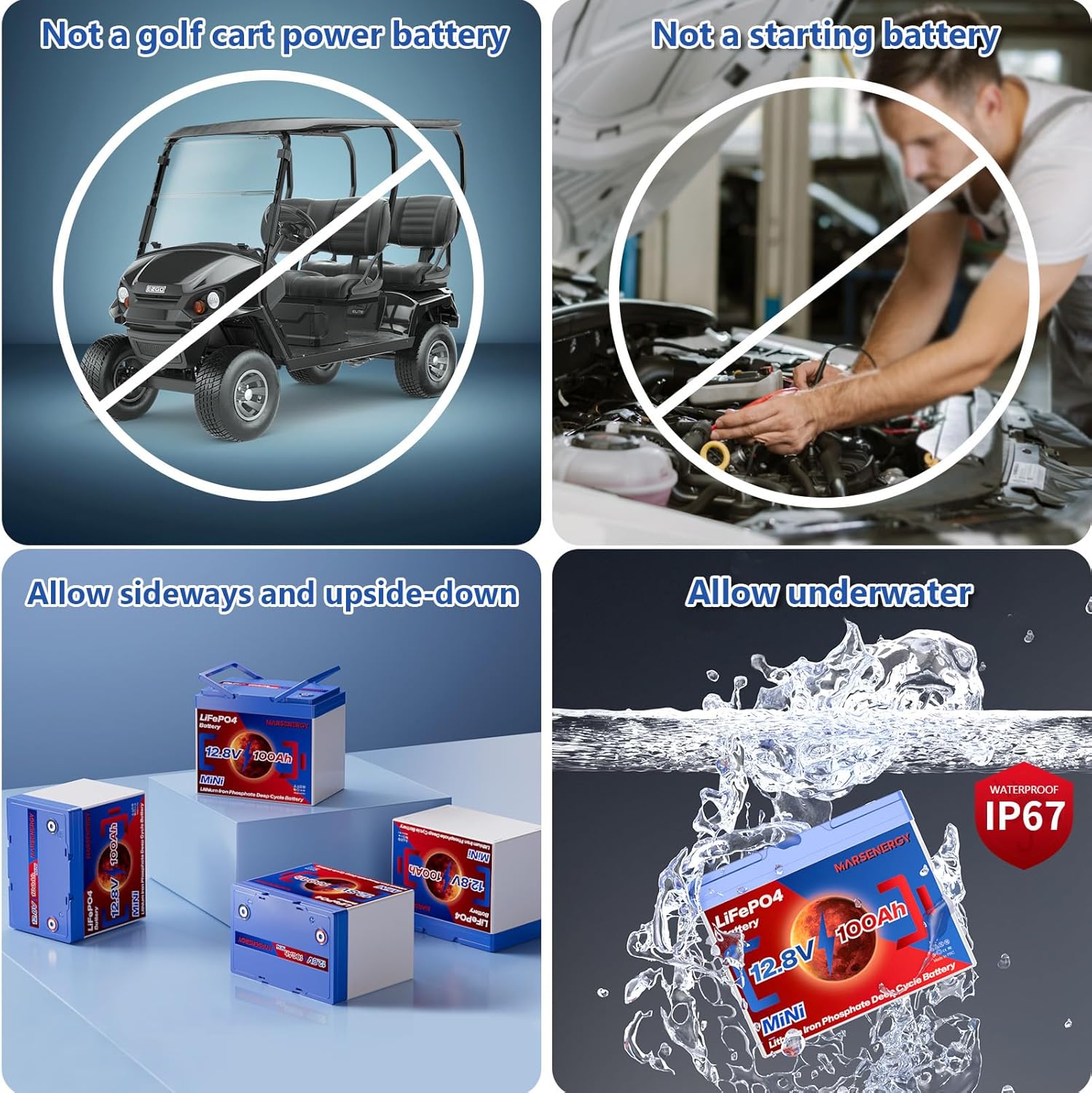 - 【Reliable quality】Every penny of cost is used to provide reliable quality of Marsenergy 12v lithium battery. Under the most extreme conditions, our batteries can withstand temp of -40℉ to 162℉ (-40℃ to 72℃), immersion 3 feet underwater for 30 minutes, high-frequency vibration, drop from a height of 3 feet, use of the battery upside down and other harsh conditions without any damage. Note: for the battery life, if internal temp of the battery < -4°F or > 150°F, the BMS will cut off the power