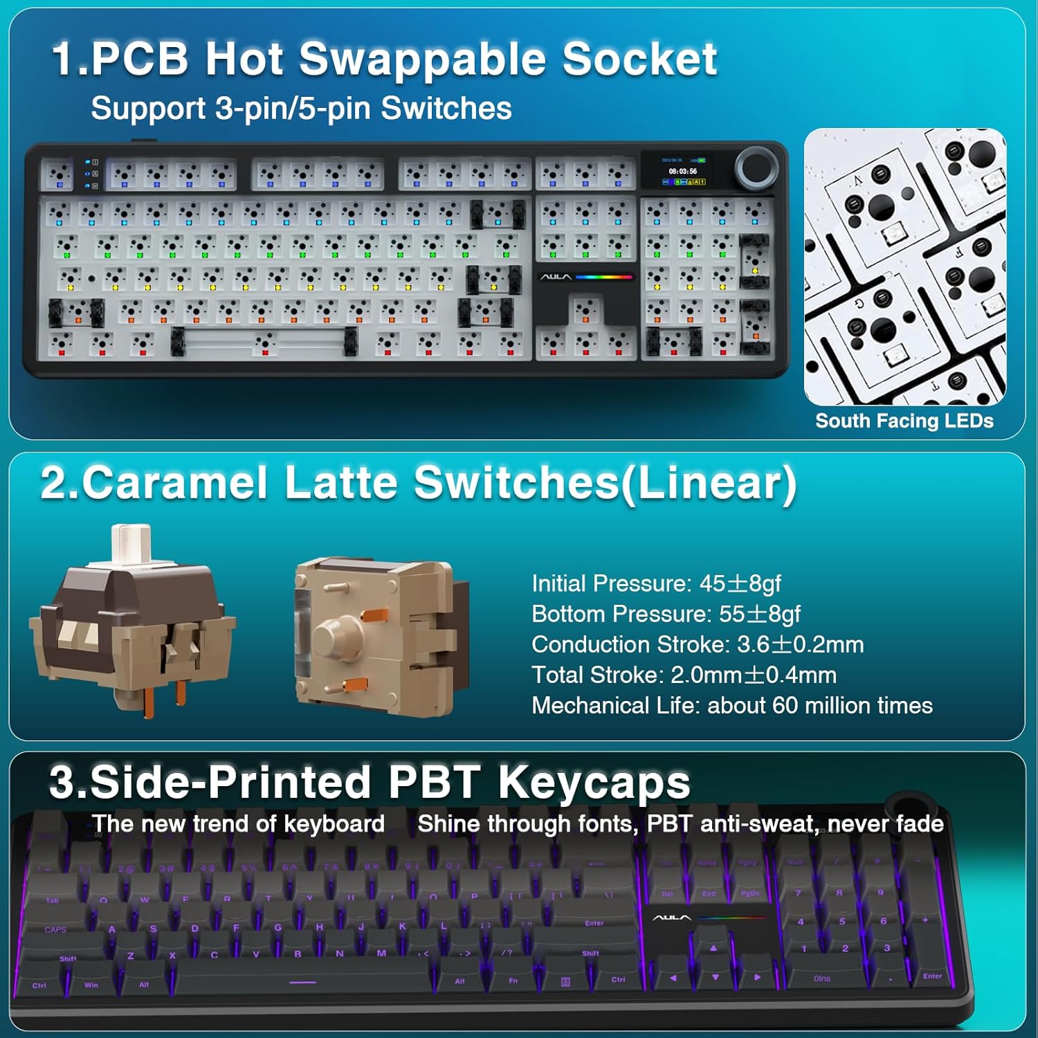 - Tri-mode Connection Mechanical Keyboard: The AULA F108 Pro gaming keyboard supports BT5.0, 2.4GHz wireless and USB-C wired connectivity which can save up to five devices. The BT5.0 mode allows for quick switching between pc,mac,laptop and tablets while the 2.4GHz wireless and USB-C wired mode with a polling rate of 1000Hz ensures highly competitive stability and responsiveness.The F108PRO pc gaming keyboard is compatible with Windows, Mac, IOS and Android operating systems, and you can easily switch systems with multifunctional knob(Note: In Linux systems, incompatible driver versions may cause abnormal F-zone functionality, which is a normal phenomenon. Please rest assured to use it)