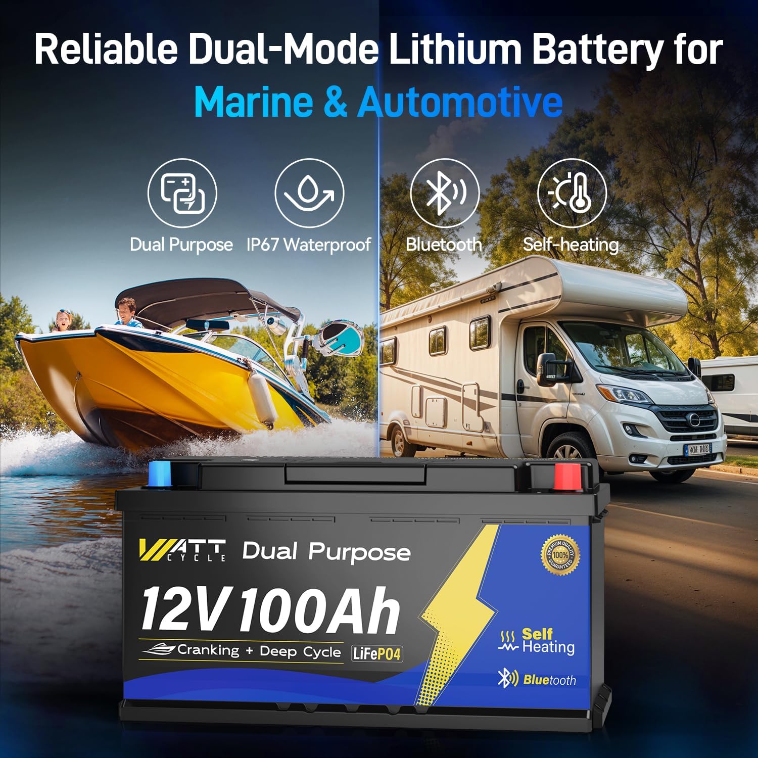 12V 100Ah Bluetooth LiFePO4 Battery, [Cranking &Deep Cycle] Lithium Battery with Self-Heating, Built-in 200A BMS, Perfect for Trolling Motor, RV, Marine, Boat(2 Pack)