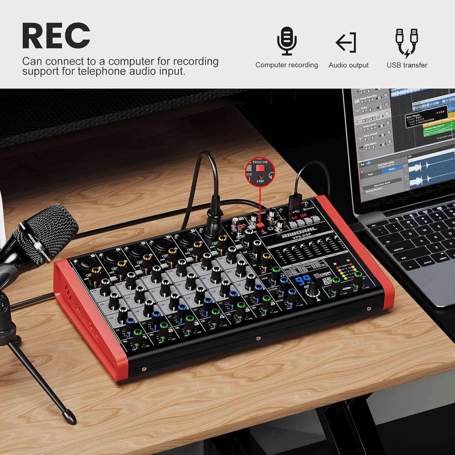 - Mic And Stereo Line Input: 6 Mono Line Inputs And 1 Group Of Tape Stereo Inputs With +48v Phantom Power Required For Condenser Microphones, High-Precision Led Peak Level Indicator And 7 Band Eq Adjustmentcan Make It Ultra-Low Noise Of High Headroom Mixer.