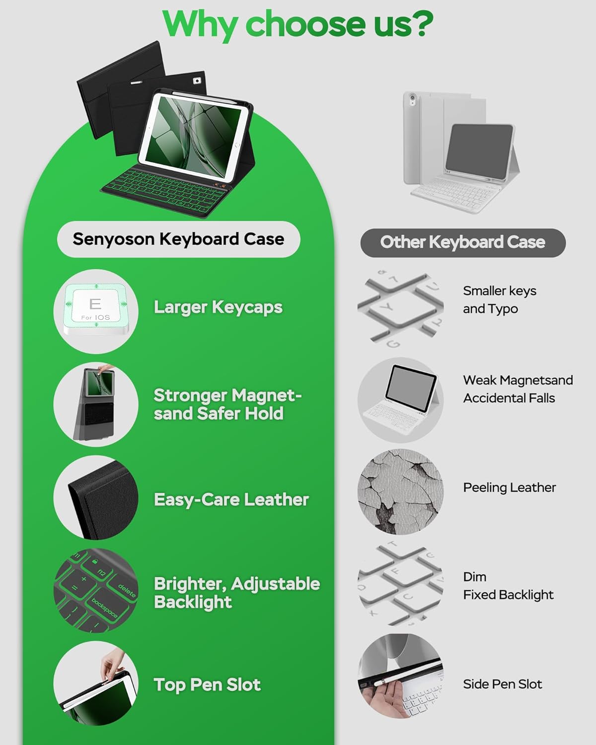 - ăPremium MaterialăSenyoson for ipad keyboard case is made of good quality PU. Soft, smooth and it gives a luxurious feeling. The interior case is made of high-quality flexible TPU with honeycomb heat dissipation. Keyboard case can protect your tablet from drops and scratches. Precise cutout allows full access to all ports, sensors, speaker, microphone and camera
