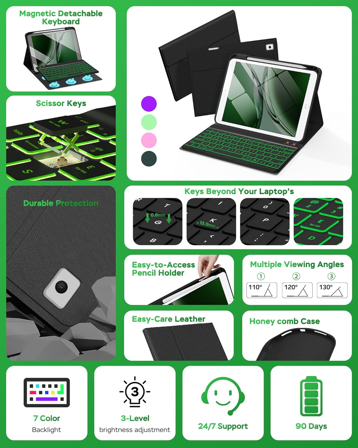 - ăAdjustable 7 Colors Backlit KeyboardăThis for ipad 8th generation case with keyboard designed with laser-etched backlit keys that allow 7 vibrant colors to shine in the dark, illuminated typing is more fun and easy. Ergonomic and mechanical scissor keys with rebound feature to reduce noise, enjoy comfortable typing even long hours