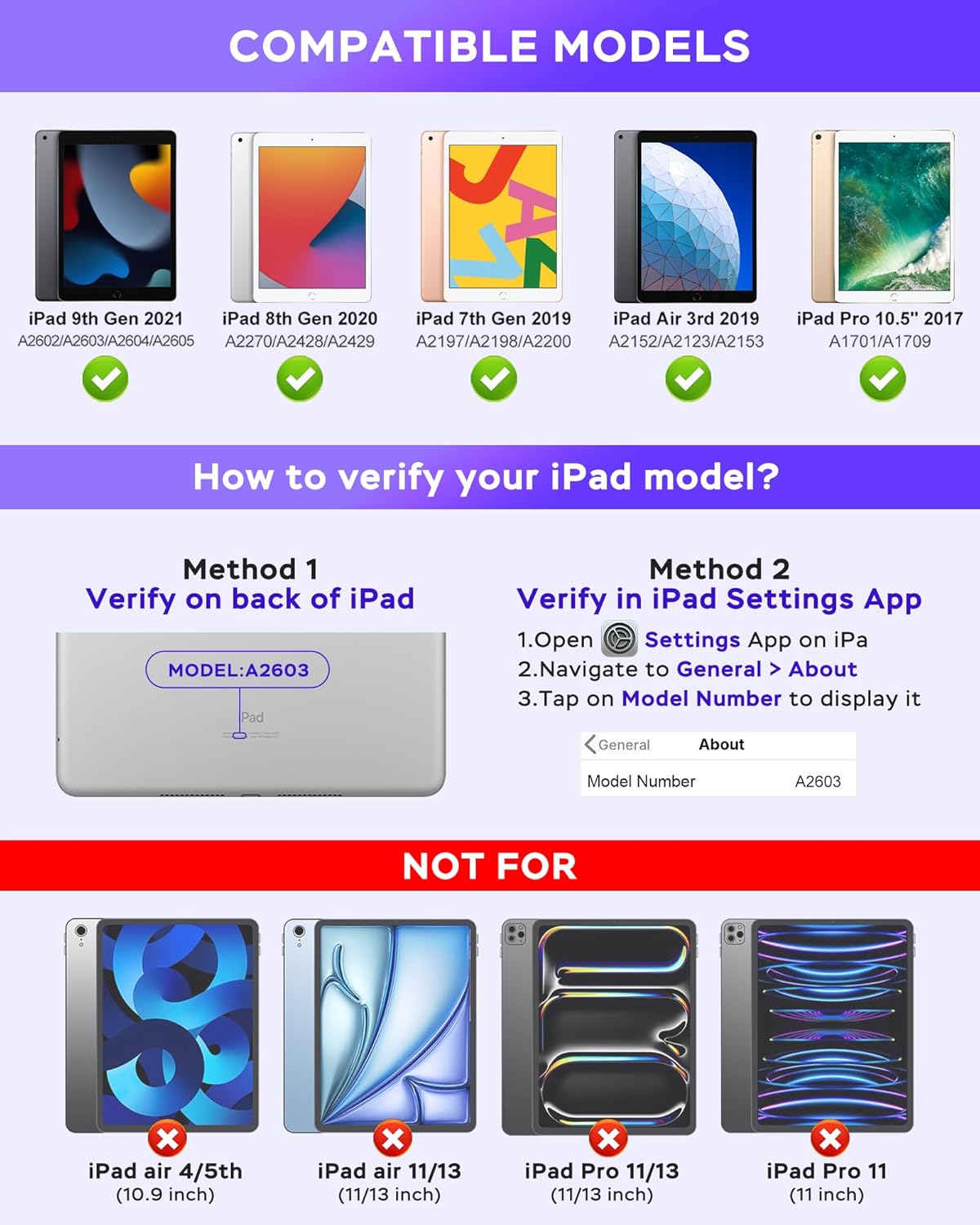 - ăFor ipad Case with Keyboard 10.2/10.5 InchăThis keyboard case compatible with iPad 9th Generation 10.2inch 2021(Model Number:A2602/A2603/A2604/A2605), compatible with iPad 8th Generation 10.2inch 2020(Model Number:A2270/A2428/A2429/A2430), compatible with iPad 7th Generation 10.2inch 2019(Model Number:A2200/A2197/A2198), compatible with iPad Air 3rd Generation 10.5inch 2019(Model Number:A2123/A2152/A2153/A2154) and compatible with iPad Pro 10.5inch 2017(Model Number: A1701/A1709/A1852). Please check the model number starting with "A" on the back of your tablet before purchasing