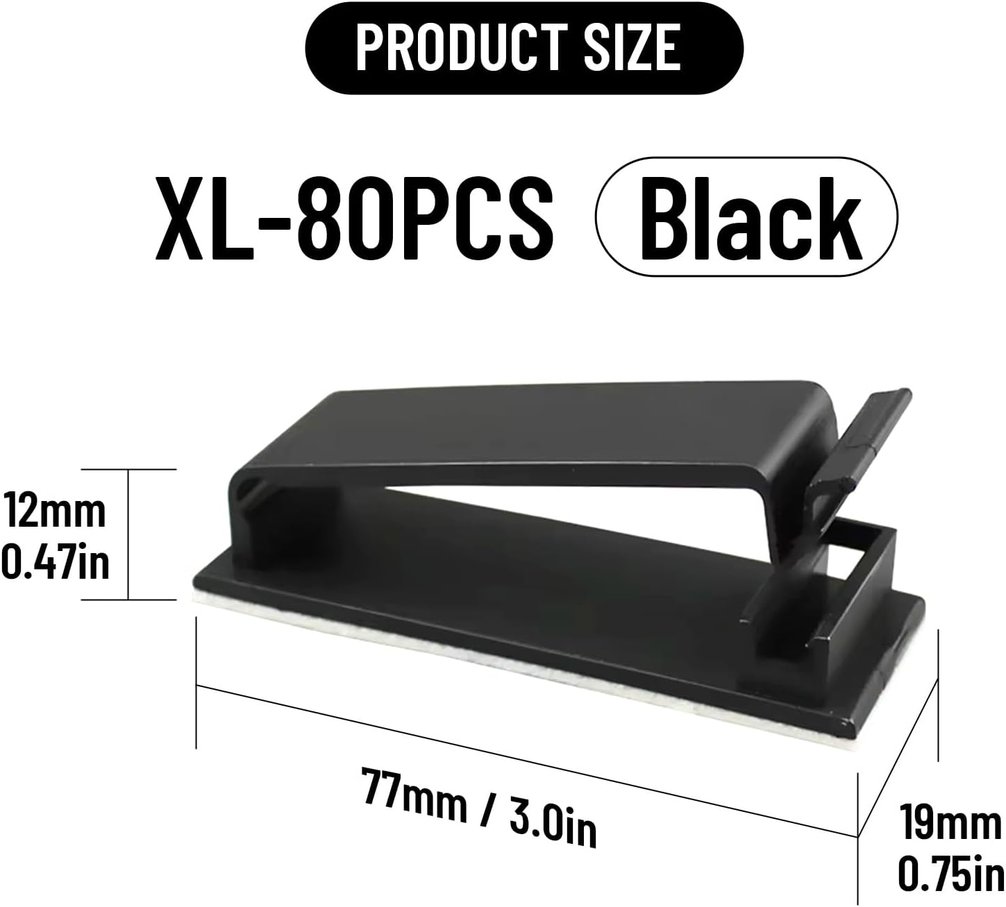 - Product Spec: Adhesive cable clips are available in 2 sizes, L (Base 2.1" x 0.75", inner diameter 1.55" x 0.25") and XL (Base 3" x 0.75", inner diameter 2.5" x 0.27"). Cable clips has 2 colors, black and white. You can choose 40, 50, 80 or 100 pieces