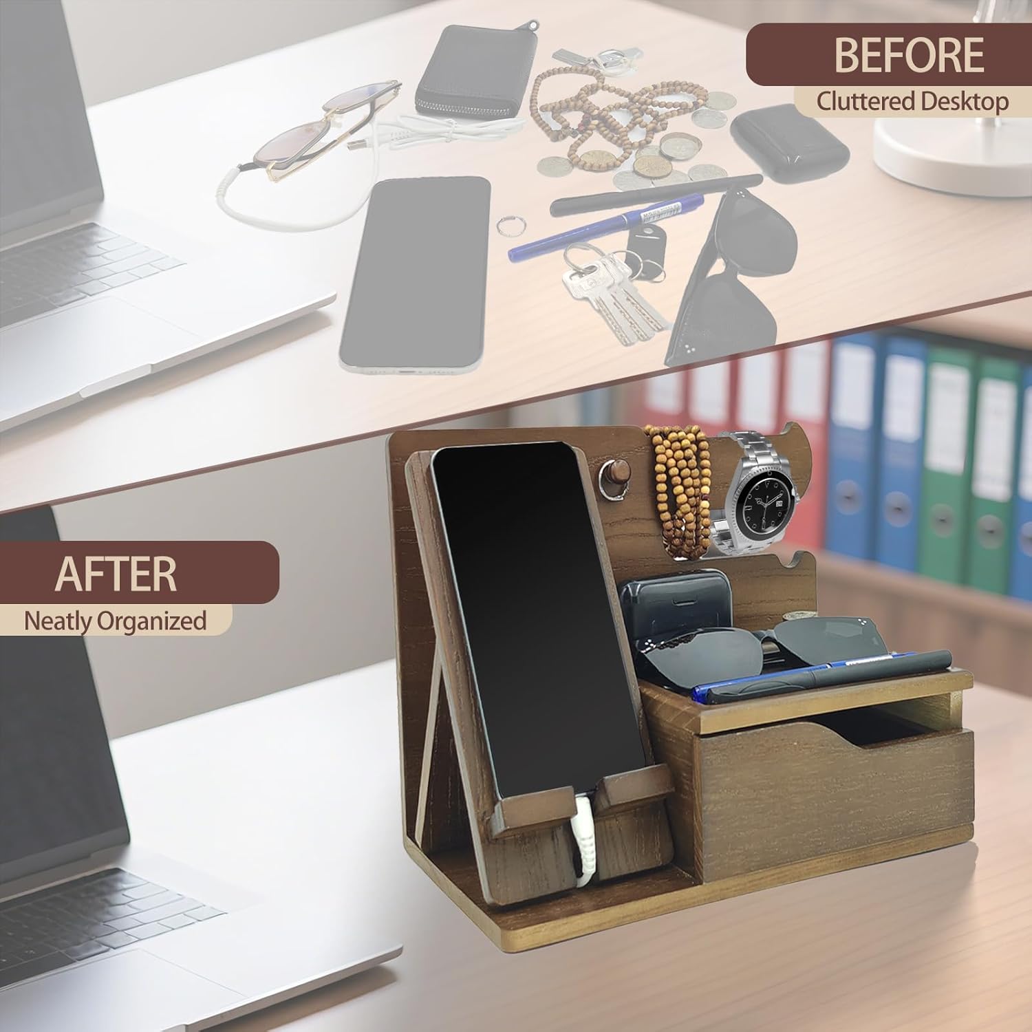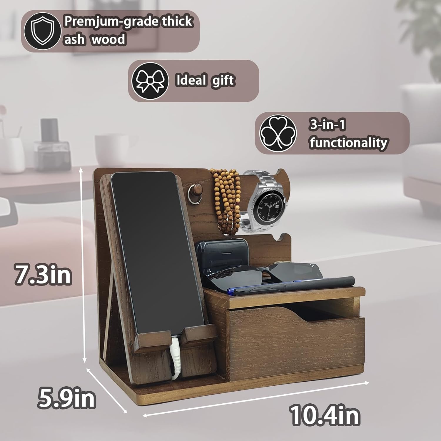 3-in-1 Wood Phone Docking Station Organizer with Drawer & Hidden Charging Hole for Phone, Keys, Glasses & Accessories, for Men (WALNUT, 01)