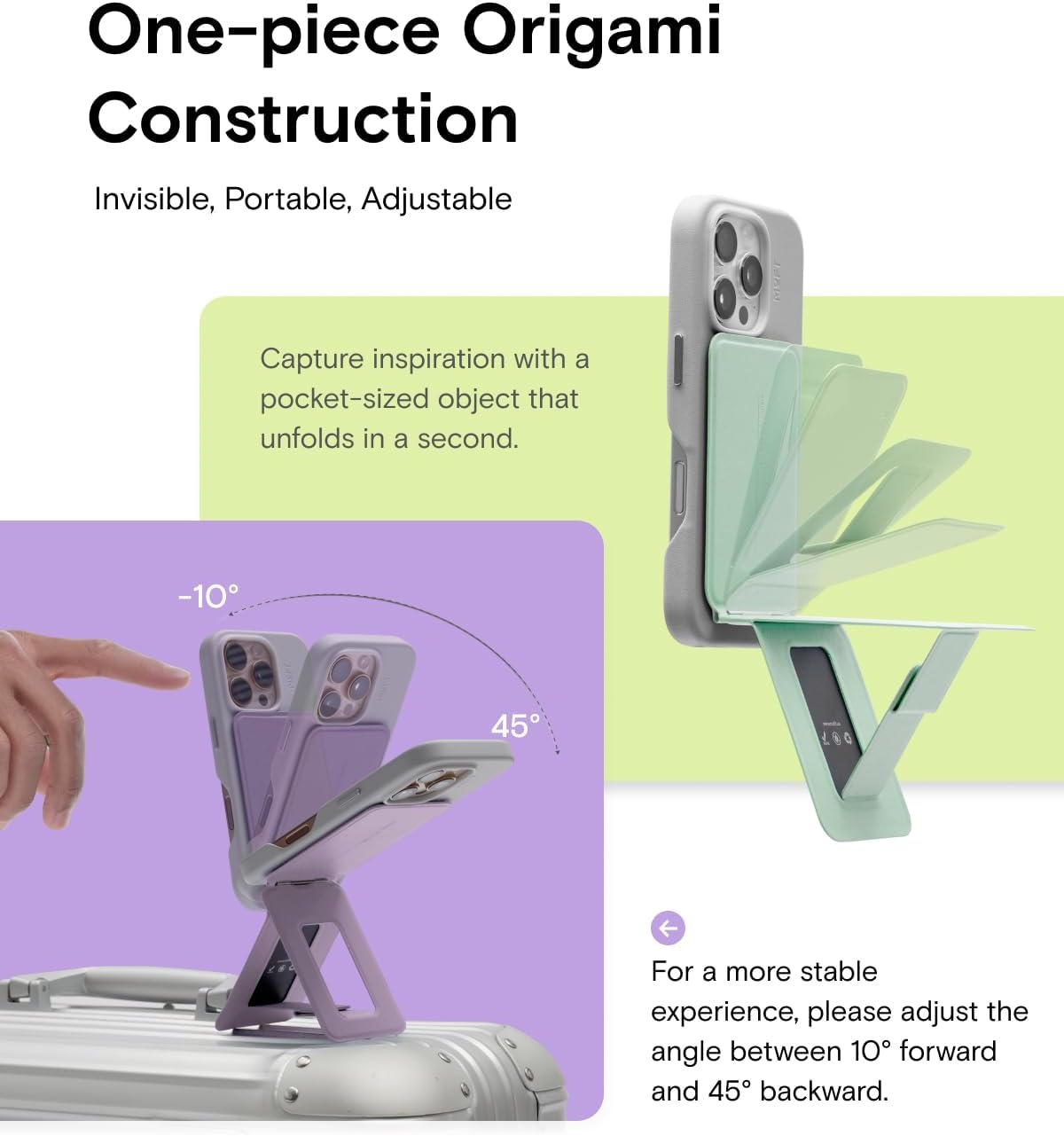 - Quick Setup & Ultra-Portable: Inspired by origami, this foldable phone tripod transforms from a slim card into a full phone tripod in seconds—no screws, loose parts, or assembly needed! At just 3oz, it’s the most compact and travel-friendly phone stand, easily carried in your bag or attached to a MagSafe case. Perfect for content creation and hands-free viewing: ideal for Self-vlogging, group vlogging, outdoor photography, video calls, browsing, online classes, or fitness.