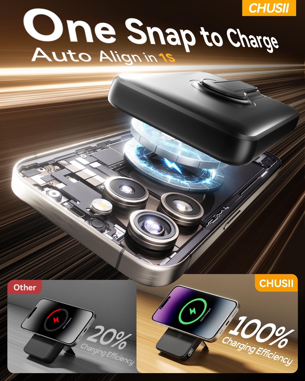 - Wireless Portable Charger- Not Constrained by βCableβ: CHUSII wireless powerbank is an ultimate go-to solution to reduce wire clutter and reduce the annoyance of plugging/unplugging charging cables. As soon as attach the battery pack, your phone recognises it and starts charging wirelessly. This feature has eliminated the hassle of dealing with loose cables and connectors, providing a seamless charging experience. The freedom it offers from wall sockets and cables allowing you to fully immerse yourself in an uninterrupted gaming experience