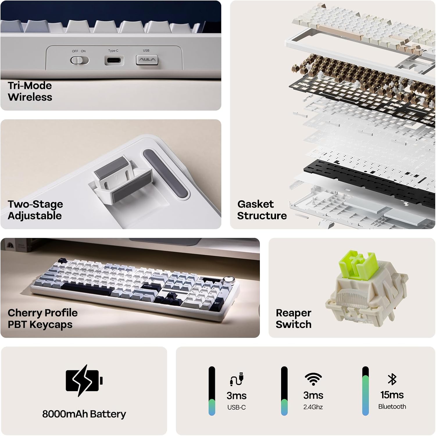 - 100% in Size, Performance and Comfort: Meet the 100% full size variation of the EPOMAKER X AULA F75 Max, the F108 PRO Mechanical keyboard that offers the same creamy sound and unparalleled performance as F75 Max but in upgraded full-size layout with customizable Screen. The 104 anti-ghosting keys deliver accuracy and greater possibilities in configuration and controlling, ideal for multitasking and fast response in gaming and office. While the 2-stage kickstand, low front height and cherry profile keycaps rid you of finger fatigue and wrist strain for a pain-free day of work