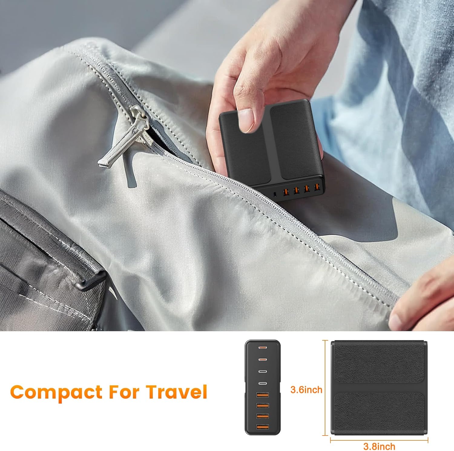 - 【Portable USB C Charging Station】Multiport USB C Charger Station perfectly charges multiple devices for home, office and travel. Small size saves you 50% space and fits easily into pockets, handbags, travel cases. The 5ft/1.5m power cord for this multiple fast charger station can be extended to the desktop, bedside, counter, nightstand, service desk, etc.