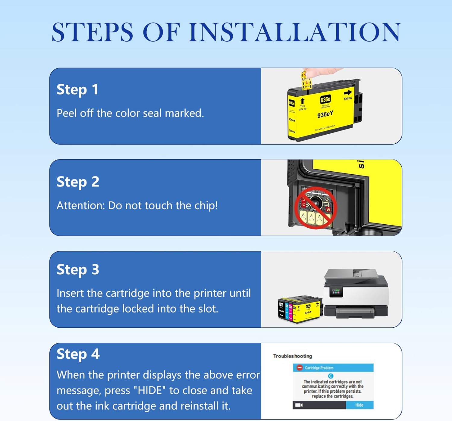 - â ăEasy to Install and UseăEach our 936e ink cartridge undergoes a strict quality testing procedure to ensure compatibility with your printer
