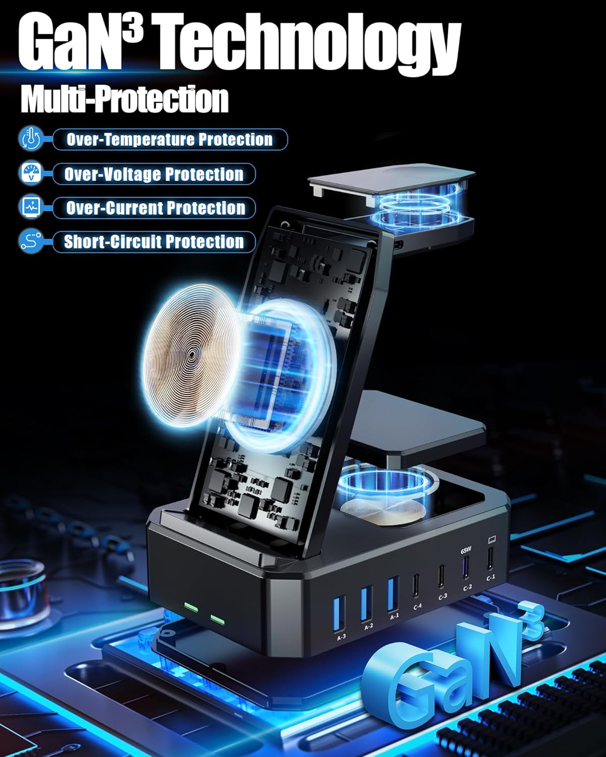 - 【Safe Charging&Multiple Protection】: Our Dual 65W PD usb c fast charger dock is equipped with the latest intelligent and efficient chipset with GaN III technology to ensure fast and safe powering of your devices. Ready to charge your Macbook series and other laptops. Our phone and watch charging station features over-current, over-voltage, over-temperature and over-charging protection. The internal circuitry is designed to prevent overcharging from damaging your device, ensuring safe charging.