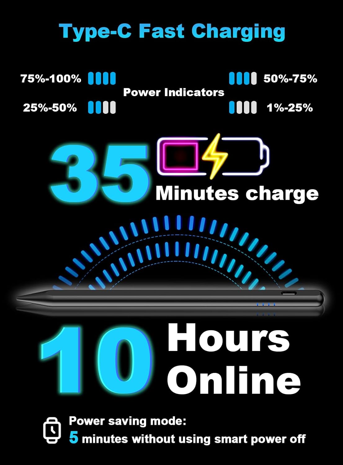 - 【Easy to Use & LED Power Display】 : Quickly tap the top button twice to turn it on/off. The touch screen pen can be used immediately and no Bluetooth connection is required. The iphone pen is equipped with a 4-LED indicator light on the side, allowing you to check the power status in real time, which is worry-free. It will automatically shut down after 5 minutes of inactivity, which is highly efficient and energy-saving