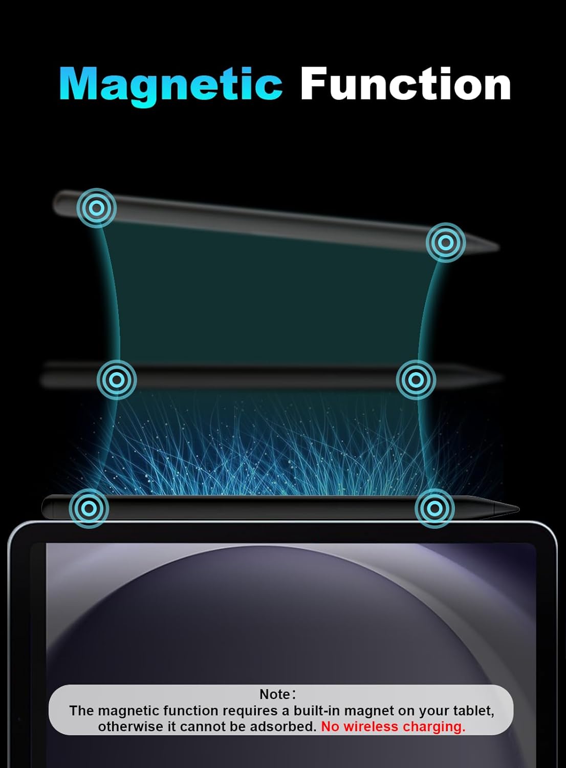 - 【Magnetic Design】 : This stylus for sumsung A9+ is equipped with two magnets. You can attach the stylus to the side of your tablet device for convenient storage and use. Tablet devices also need to have built-in magnets; otherwise, the stylus cannot be magnetized either