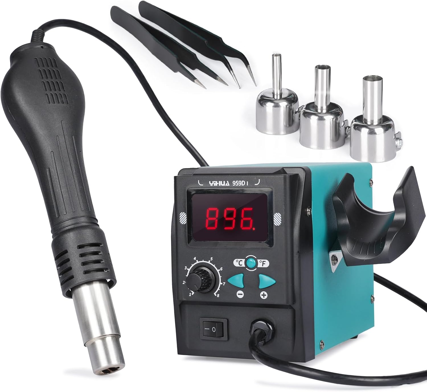 - Included Components : 1 x 959D-I Hot Air Rework Station, 2 x Pairs of ESD Safe tweezers, 3 x Hot air gun nozzles