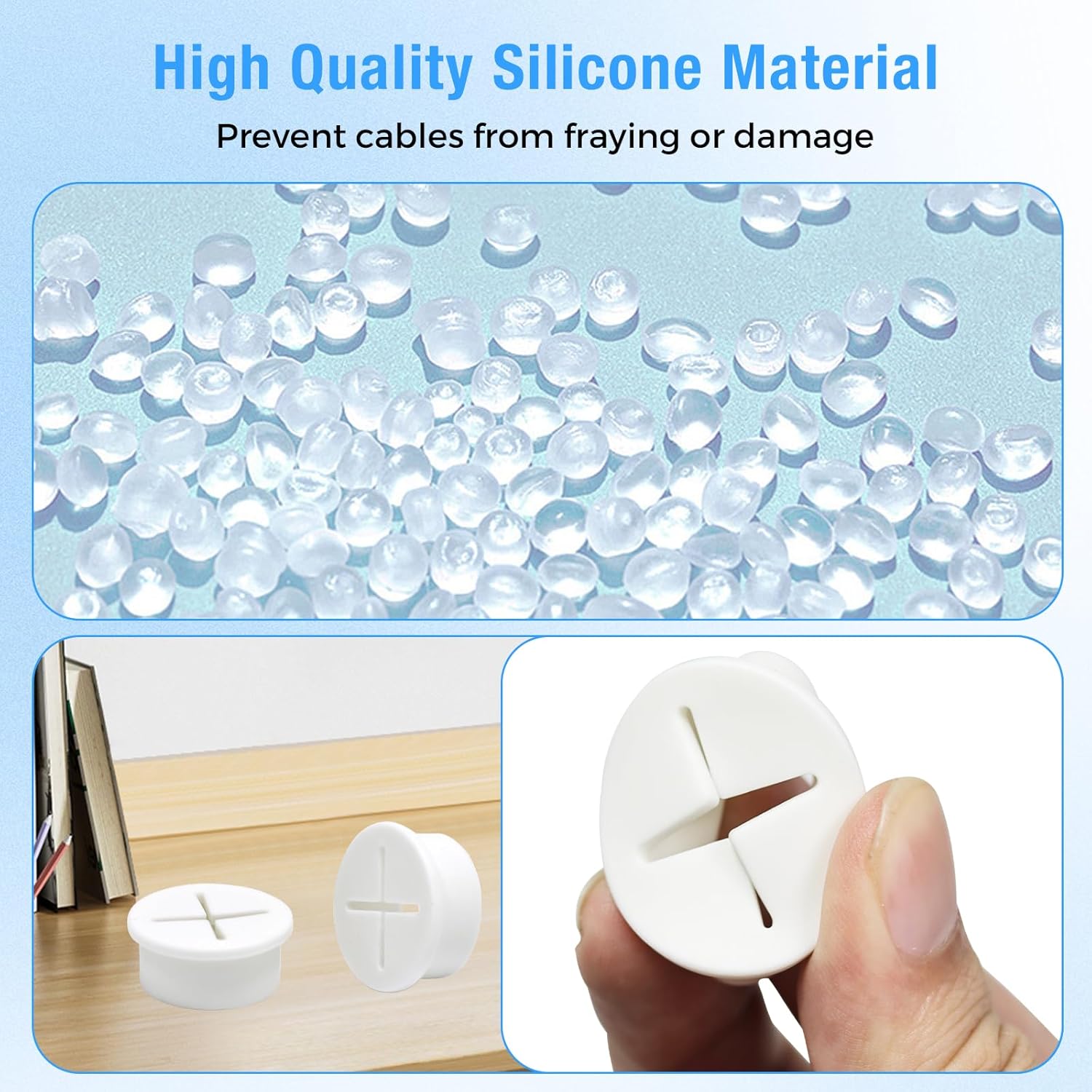 - Maintain Safety: The desk wire hole insert helps to organize cables on your desktop, keeping it tidy and improving productivity; Cable grommet smooth surface protects cables from sharp edges, reduces bending and pulling of cables, extends cable life and ensures a safe work area