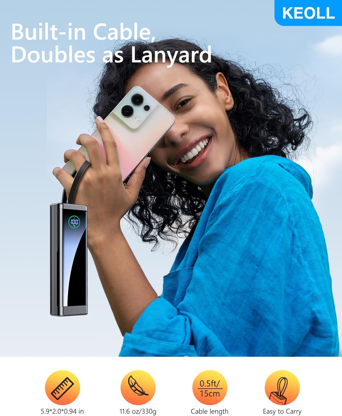 - 2 Ports +1 Cable Portable Charger: Portable phone charger has a built -in USB-C cable means it's always ready to charge your phone( for iPhone 16/15 Series and other USB-C devices), no more "having the power bank but no cable". It also has a USB-C and USB-A ports for charging other devices. KEOLL power bank delivers consistently fast and efficient output without any hiccups
