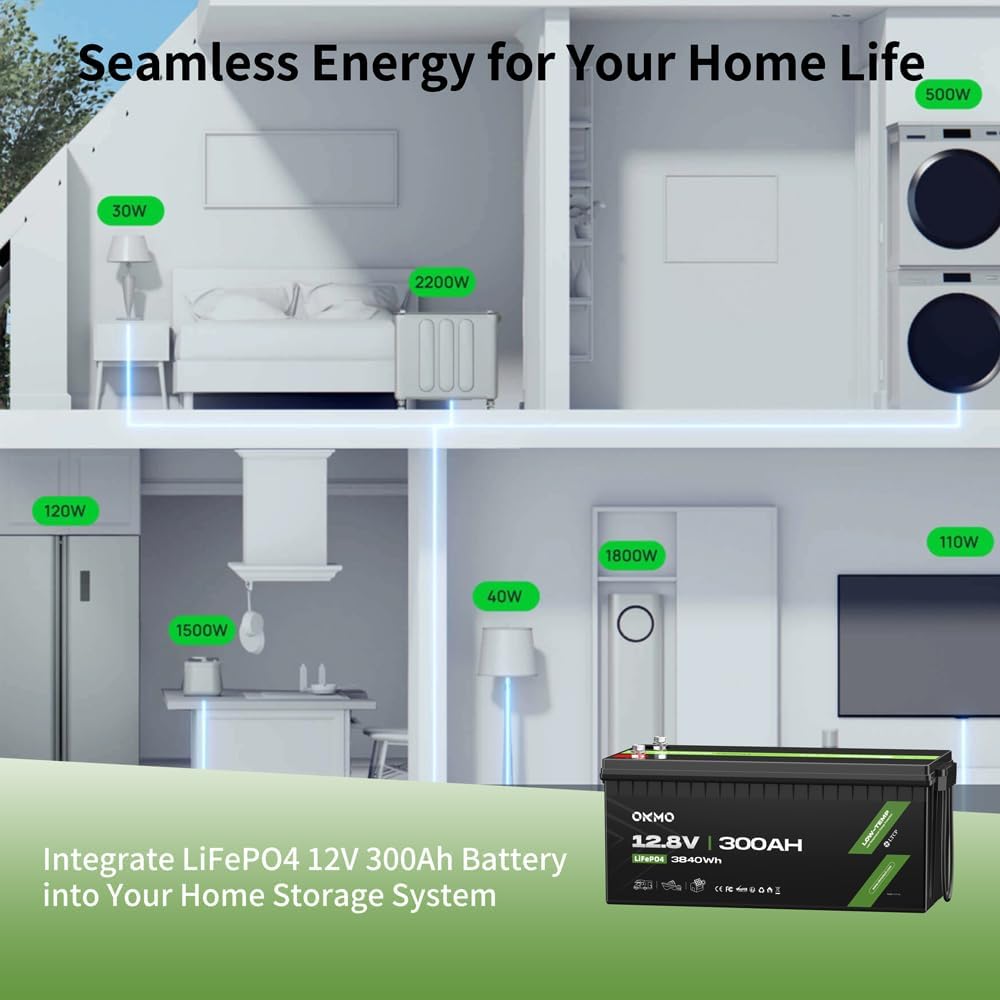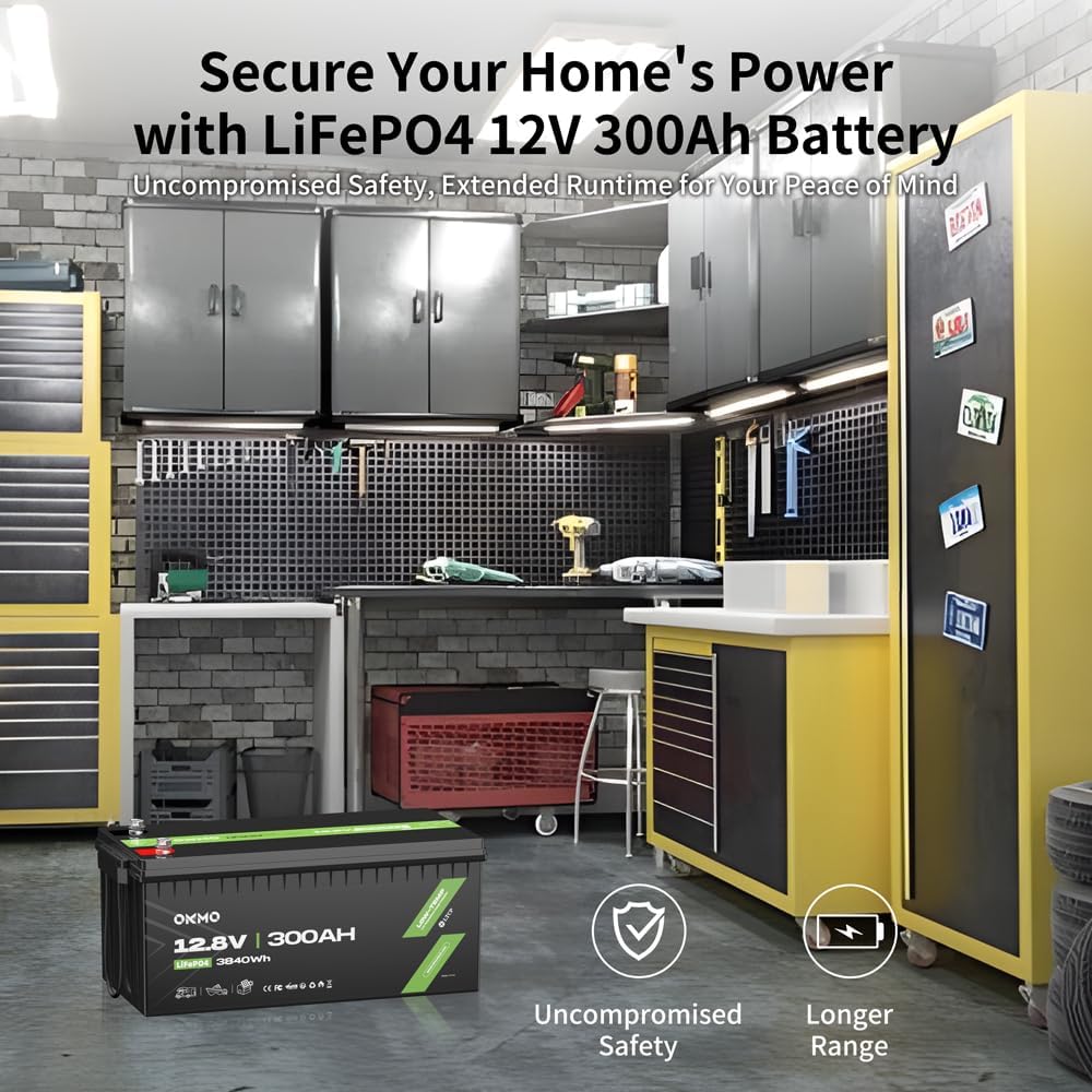 OKMO 12V 300Ah LiFePO4 Lithium Battery 150A BMS 3840Wh Rechargeable Battery for Solar Systerm,RV,Camping,Battery Backup,Marine and Home Energy Storage