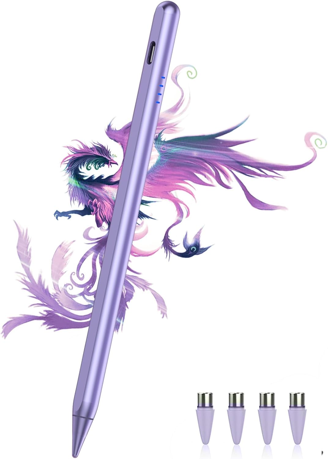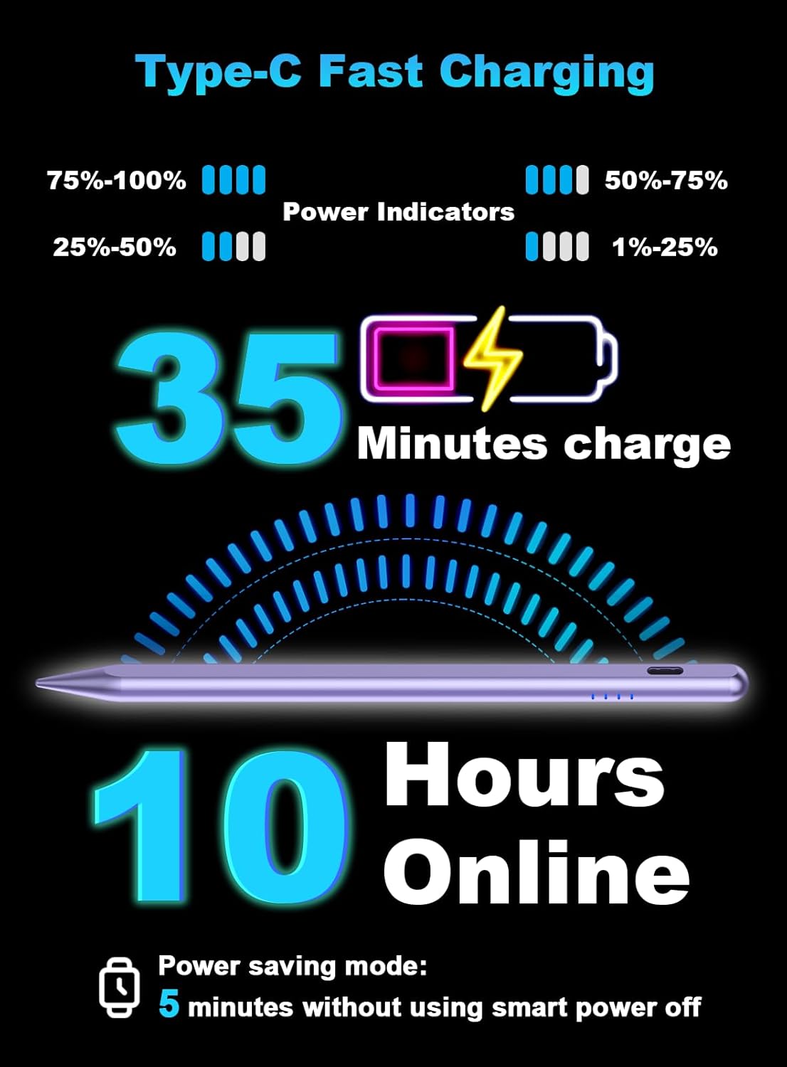 - 【Easy to Use & LED Power Display】 : Quickly tap the top button twice to turn it on/off. The touch screen pen can be used immediately and no Bluetooth connection is required. The iphone pen is equipped with a 4-LED indicator light on the side, allowing you to check the power status in real time, which is worry-free. It will automatically shut down after 5 minutes of inactivity, which is highly efficient and energy-saving