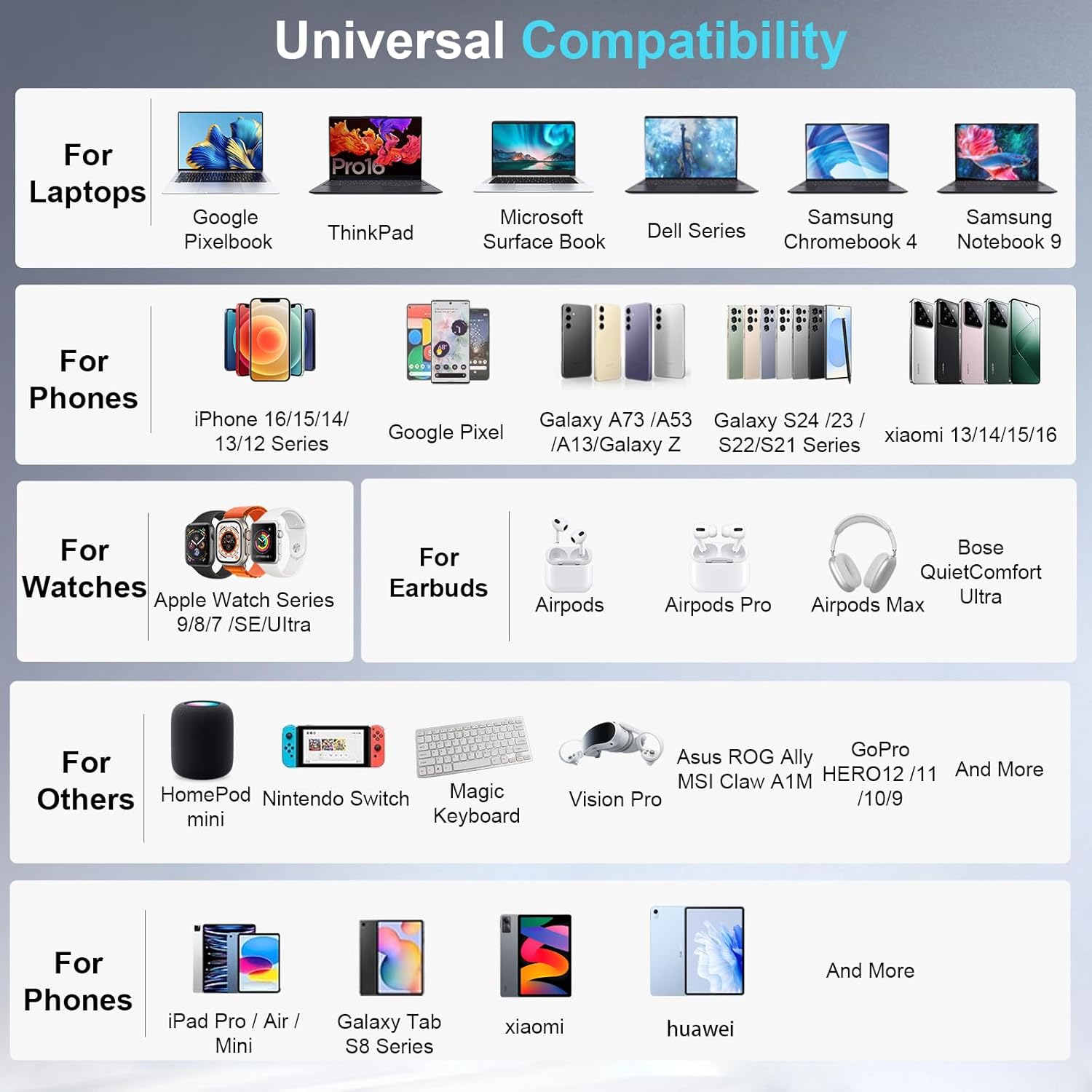 - Compatible Devices : Compatible with Smartphone, Tablet, Smartwatches, Speakers, Laptops,Headphones, such as MacBook Pro 13''/ MacBook Pro 15''/ MacBook Pro 16"/ MacBook Air 13''/ MacBook 12''; iPhone 16/15/14 14plus 14 pro max 13/ 13 Mini/ 13 Pro/ 13 Pro Max, iPhone 12/ 12 Mini/ 12 Pro/ 12 Pro Max/ XS/ XS Max/ XR/ X/ 11/ 11 Pro/ 11 Pro Max/ iPhone SE 2020/ 8 Plus/ 8; Samsung Galaxy S21+/ S21/ S21 Ultra/ S21 FE/ S20+/ S20/ S10/ S10e/ S10+/ S9/ S9+/ S8/ S8+/ Note 20/ Note 9/ Note 8/ Z Flip/ Z Fold; Dell XPS 15/ 13; Google Pixel 5/ Pixel 4a/ 4 XL/ 4/ Pixel 3a/ 3a XL/ 3 XL/ 2 XL /2; iPad Pro 12.9''/ iPad Pro 10.5''/ iPad Pro 11''/ iPad Mini Series/ iPad Air Series; AirPods Pro, Nintendo Switch; LG G7/ V30+; Nexus 5X/ 6P, Sony XZ2 Premium, Sony XZ3, and more. Compatible with Smartphone, Tablet, Smartwatches, Speakers, Laptops,Headphones, such as MacBook Pro 13''/ MacBook Pro 15''/ MacBook Pro 16"/ MacBook Air 13''/ Ma… See more