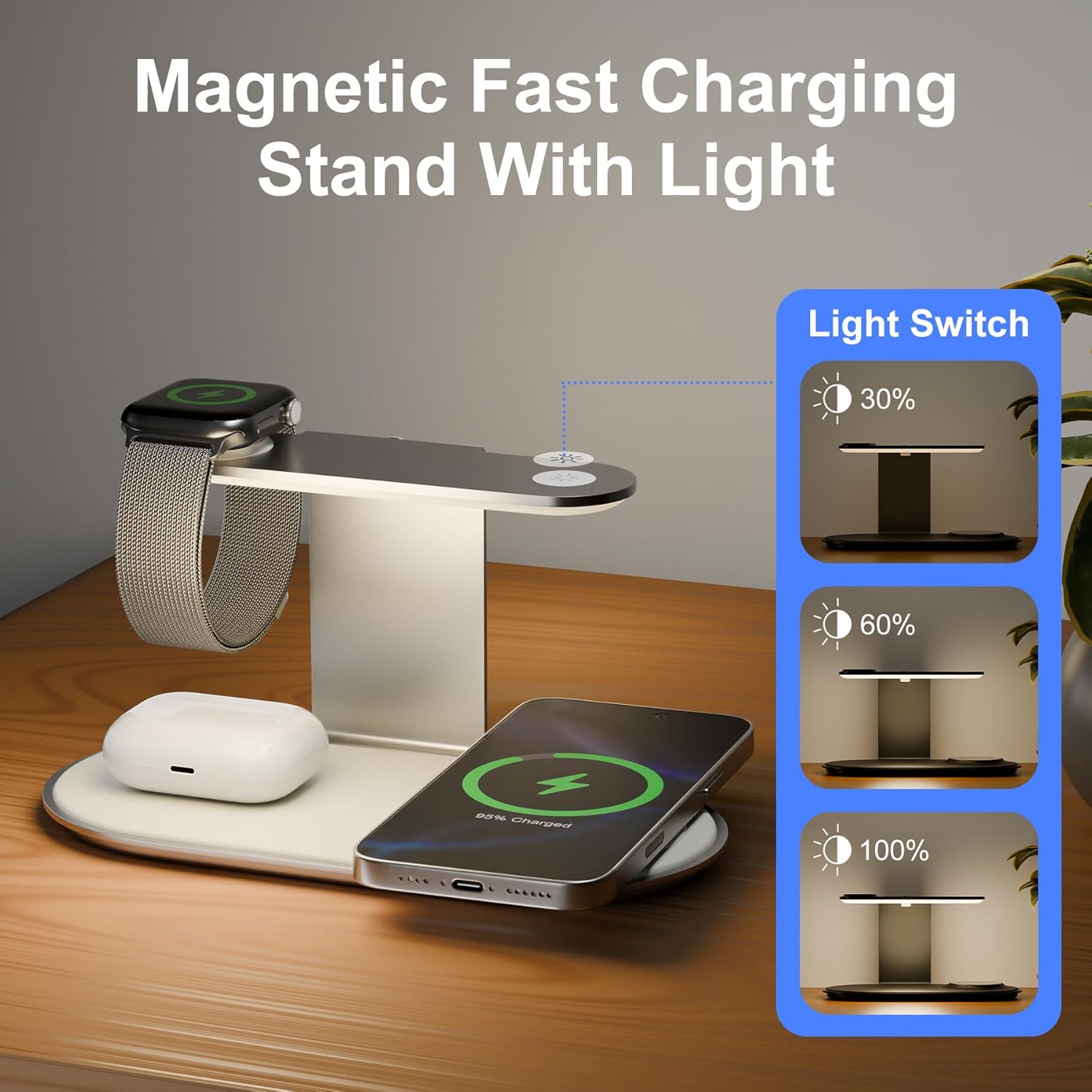 4-in-1 for Magsafe Wireless Charging: 15W Qi Magnetic Fast Charger Station Pad with Night Light for iPhone 16 15 14 13 12 Pro Max - for Apple Watch and AirPods Series - Desk Nightstand Bedside, Silver