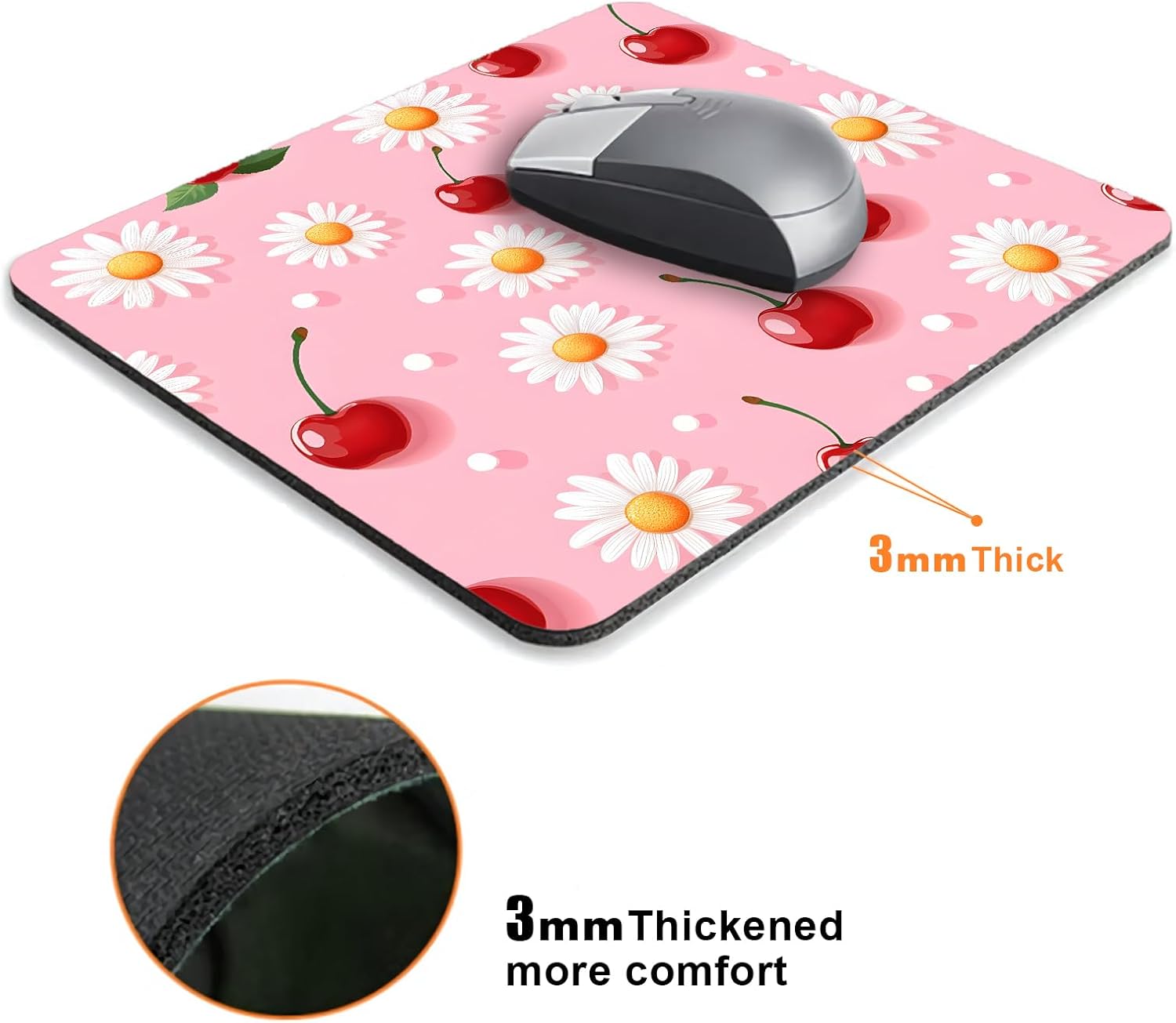 Pink Daisy Cherry Mouse Pads for Desk, Portable Wireless Computer Mouse pad Small Design with Women, Non-Slip Rubber Base Laptop Mousepad 9.5" x 7.9" Smooth Surface for Office & Travel