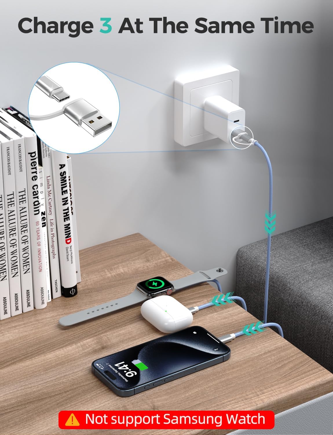 - ă3 in 2 Charging DesignăThere are 6 charging ways- USB C/A to Watch charger & USB C/A to cable & USB C/A to Type C Cable. The multiple charger support simultaneously charge 3 devices with a USB C/A adapter( Not included ) Compatible for all Watch ultra series 10/9/SE/8/7/6/5/4/3/2/1,the L-Port is compatible with Phone14/13/12/Pro/Max/Pad,USB C is for Phone 16/15/15 Pro/15 Plus/15 Pro Max,Samsung Galaxy S23/ S23+/ S23 Ultra/S22/ S21/ S20/ S20+