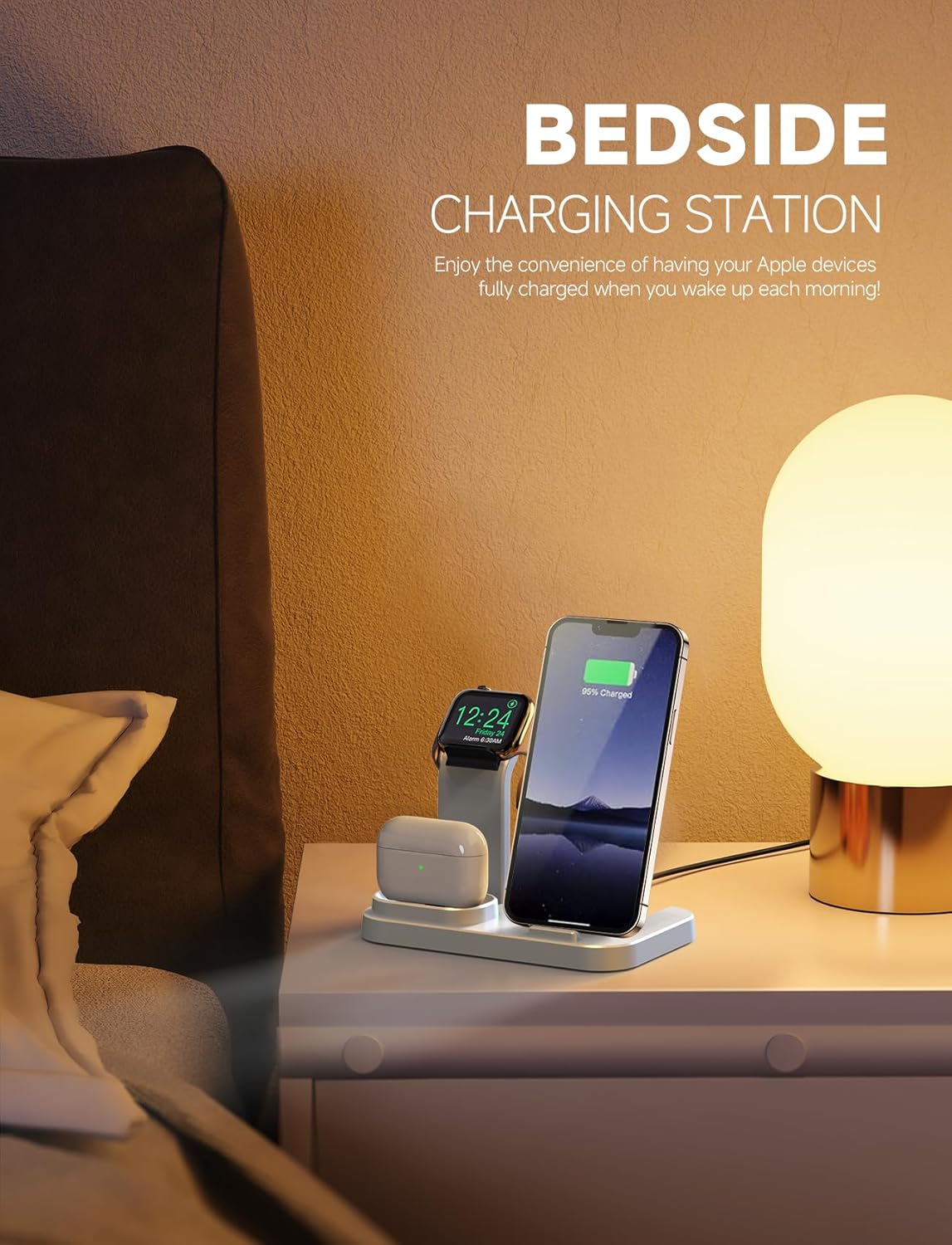 - 【What You Get】The 3-in-1 bedside charging station includes a 15W adapter, a Type-C cable, a User manual, and a two-year warranty. This charging station is the perfect way to keep your desk or nightstand neat and tidy and eliminate multiple cords. It also makes a great gift for friends and family, and you can all enjoy the convenience of having your Apple devices fully charged when you wake up.
