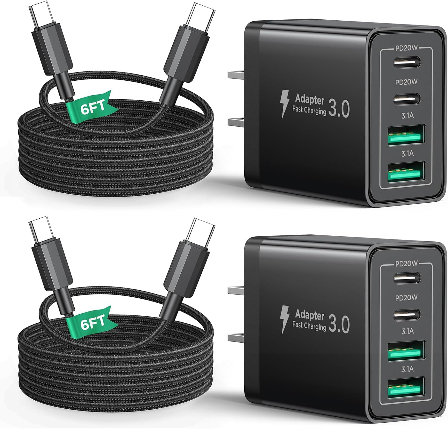 40W USB C Charger Cube, 2Pack 4-Ports Wall Plug Fast Charging Block with 6FT USBC to USBC Cord, Multiport Brick Type C Box Compatible with iPhone 16/15, Samsung S25 S24 S23, iPad, Cellphones Charger