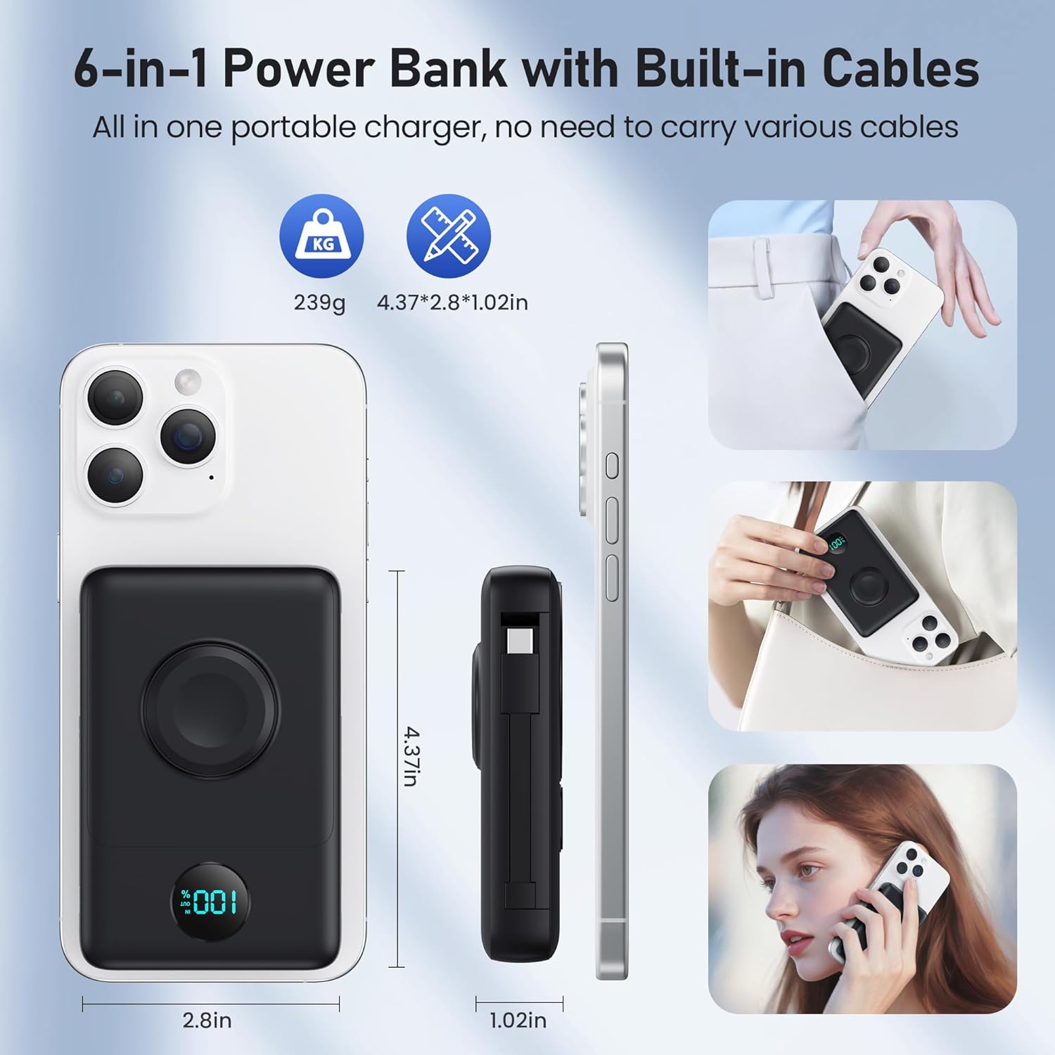 Magnetic Portable Charger for iPhone with Built-in Cables, 6-in-1 10800mAh Power Bank with iWatch Charger & LCD Display,25W PD Fast Charging Battery Pack for Magsafe,iPhone 16/15/14/13/12,Apple Watch