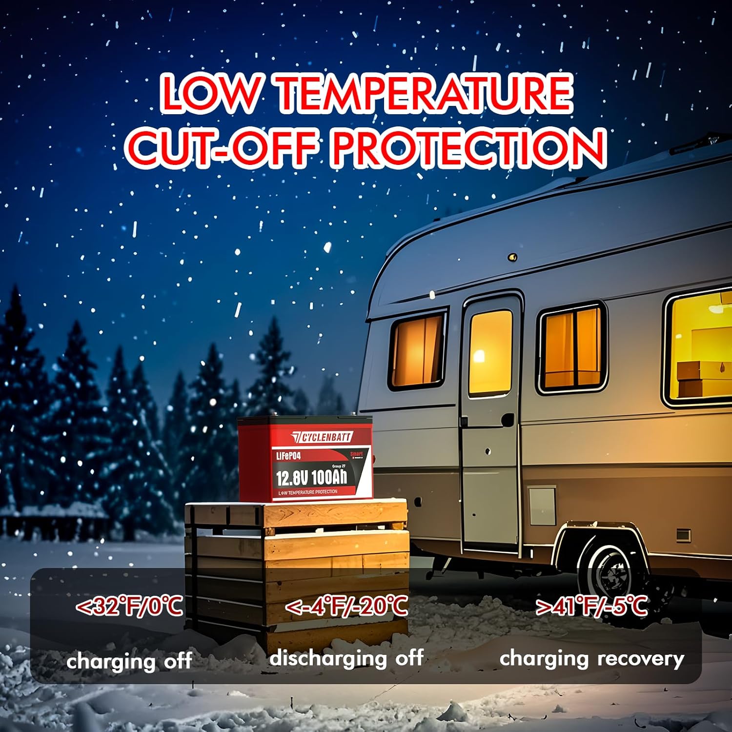 - ăNo Fear of Low Temperature EnvironmentsăThe 12V lithium battery comes with a low-temperature shutdown function. When the temperature sensor detects that the battery temperature falls below 32â, the BMS will cut off charging. If the temperature drops below -4â, it will cut off discharging, ensuring the battery is protected in low-temperature environments. The lithium batteries 12V is ideal for marine battery, trolling motor battery, RV battery, boat battery, and solar panel battery.