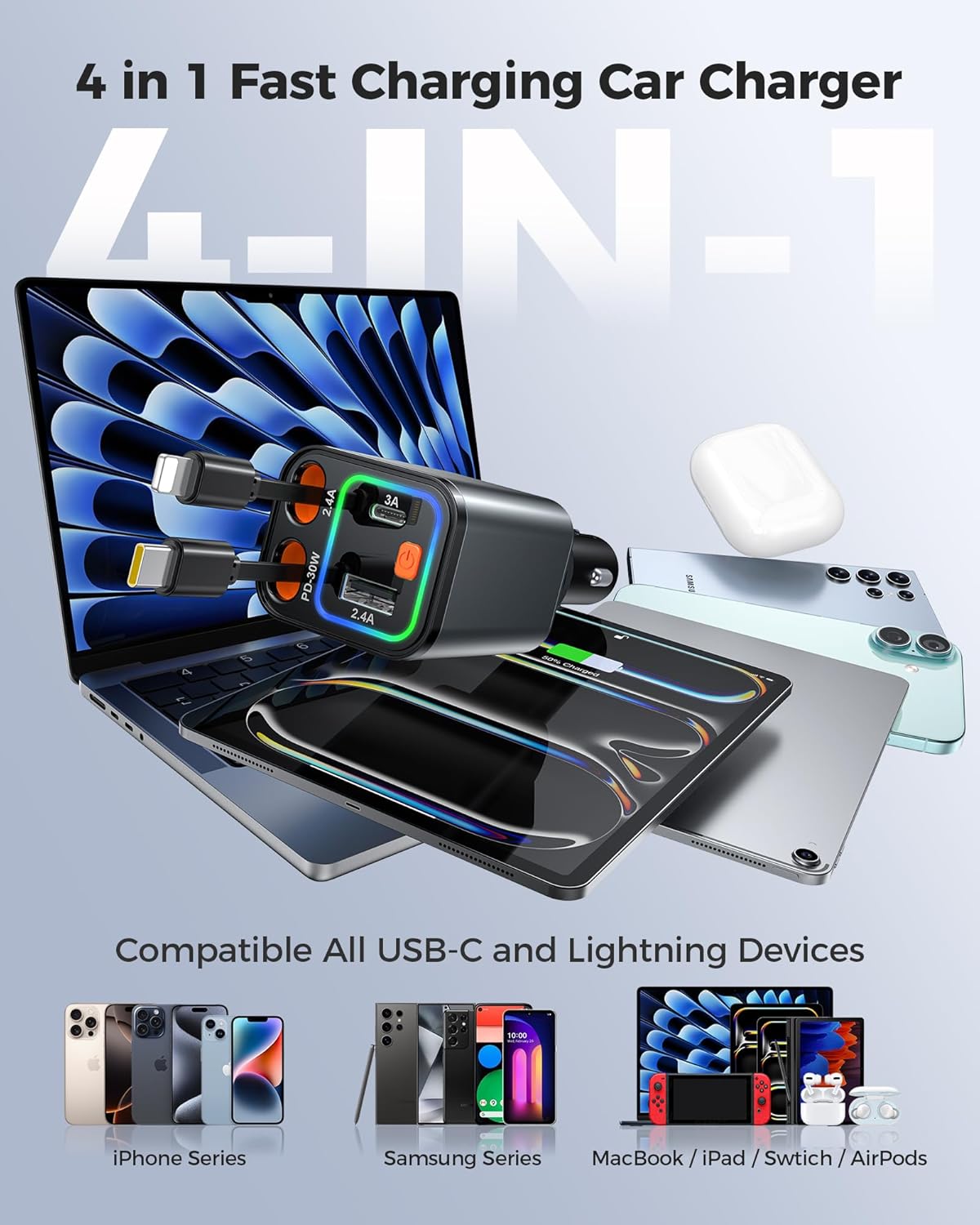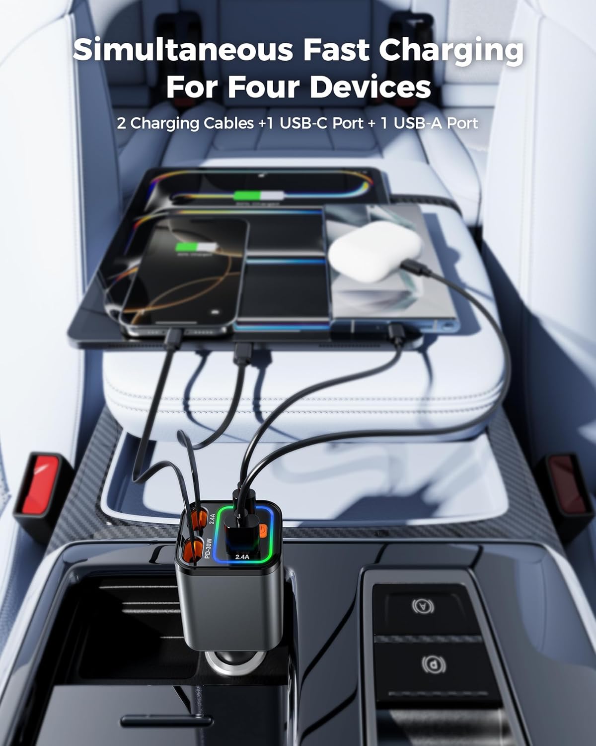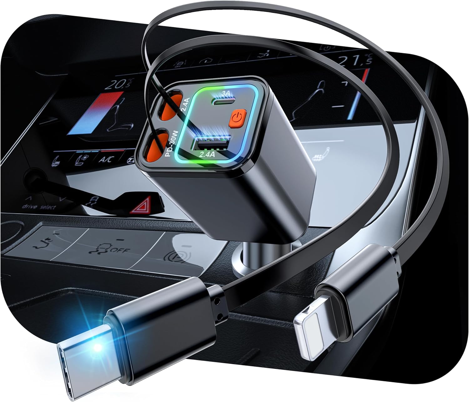 - Multi port car charger: The multi device charging mode of this 84W 4 in 1 car cigarette lighter can meet the diverse charging needs of users during their journey. The built-in C-type and L-type telescopic charging cables can meet the charging needs of almost all smart devices. The PD port supports fast charging and can charge the iPhone 16 to 50% in half an hour, allowing you to say goodbye to battery worries; The QC port, when paired with other charging cables, can meet the charging needs of other small devices during travel, perfectly solving the charging problem during the journey and making your trip more enjoyable
