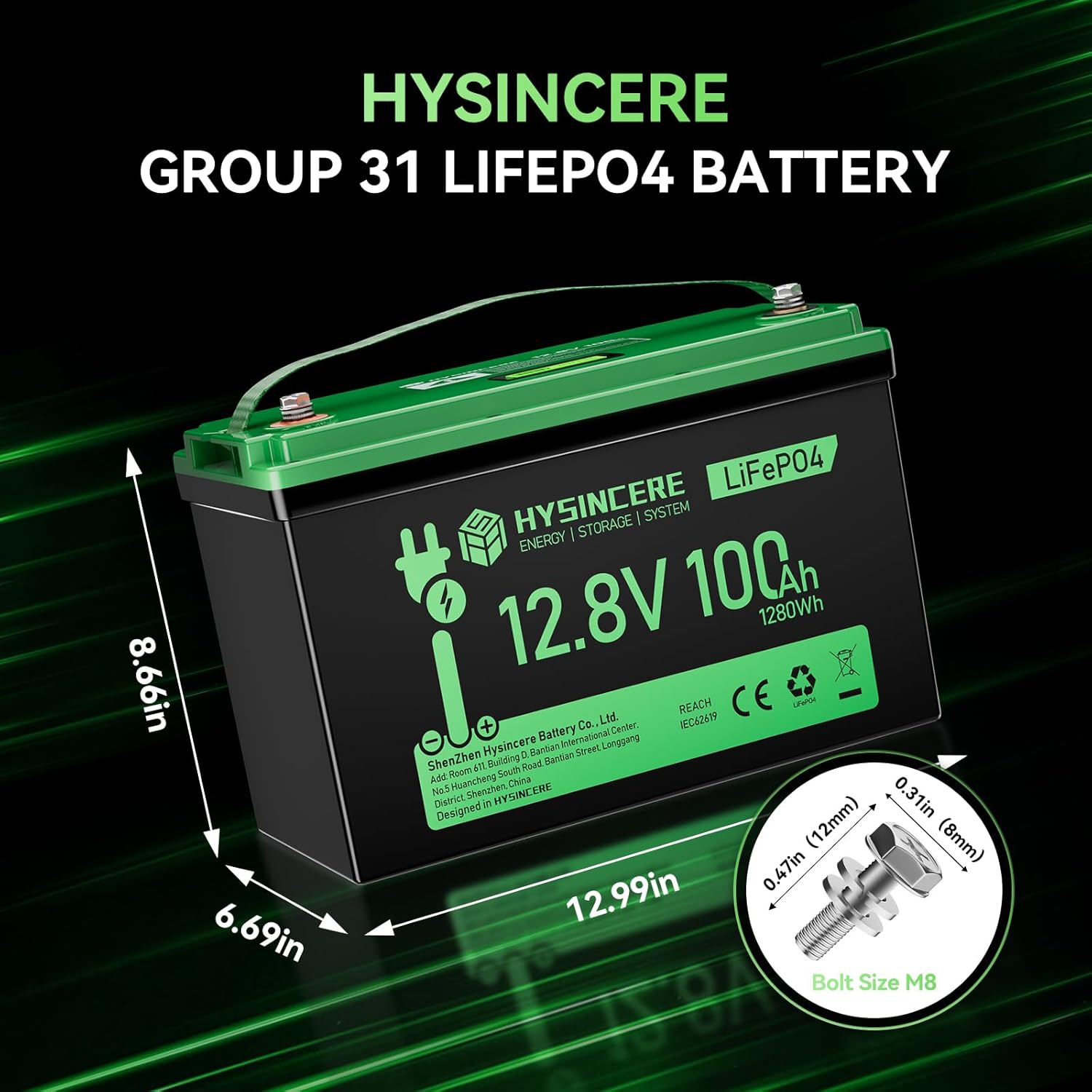 - ăđGroup 31 LiFePO4 BatteryăHYSINCERE 12V 100Ah LiFePO4 Battery size only 12.99*6.69*8.66 inch, Compatible with the Group 31 battery box, It is globally compatible with the Group 31 battery box and all types of vehicles on the market, perfect replacement for lead-acid & AGM, SLA batteries, no maintenance or complicated operation or wiring is required.