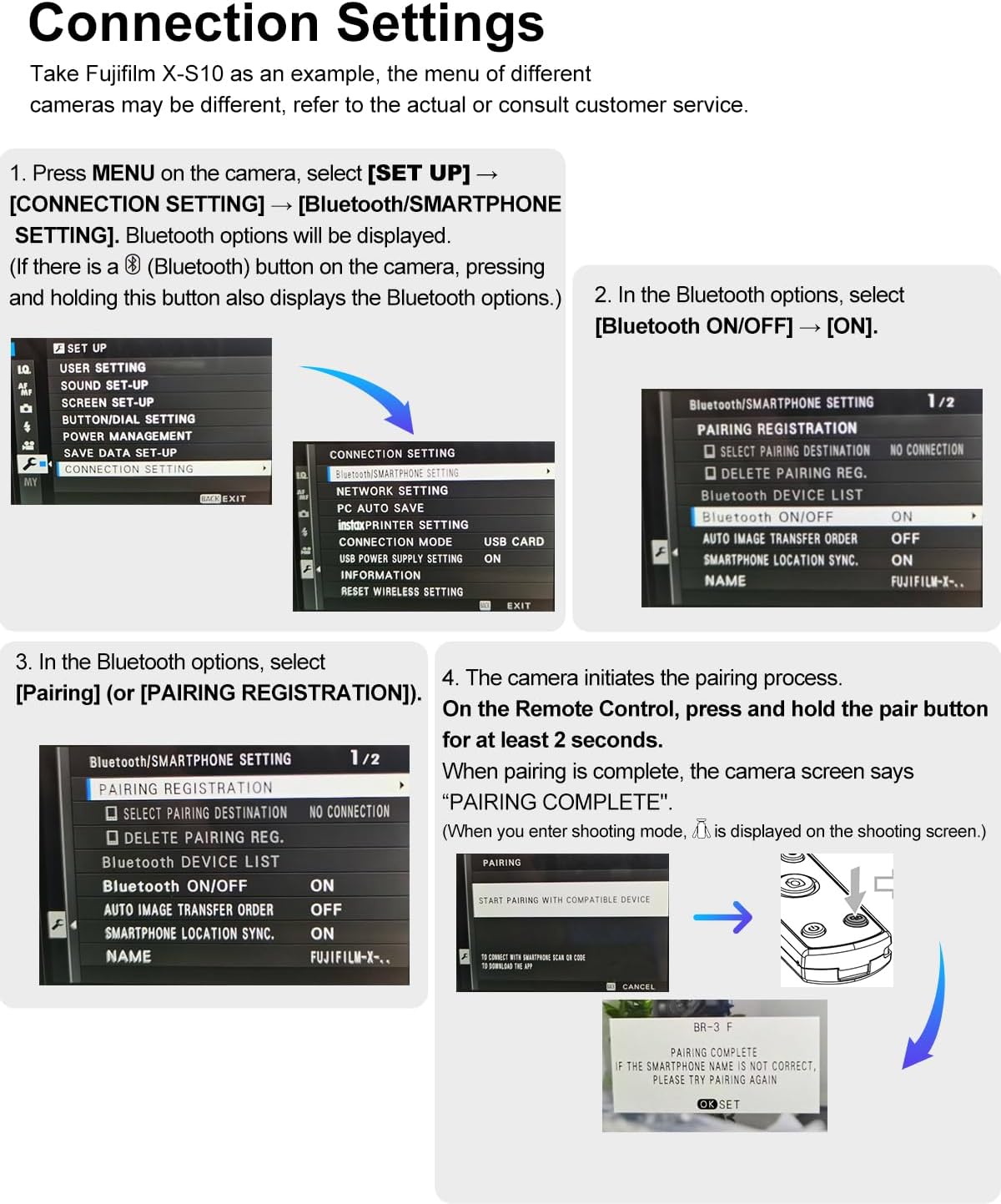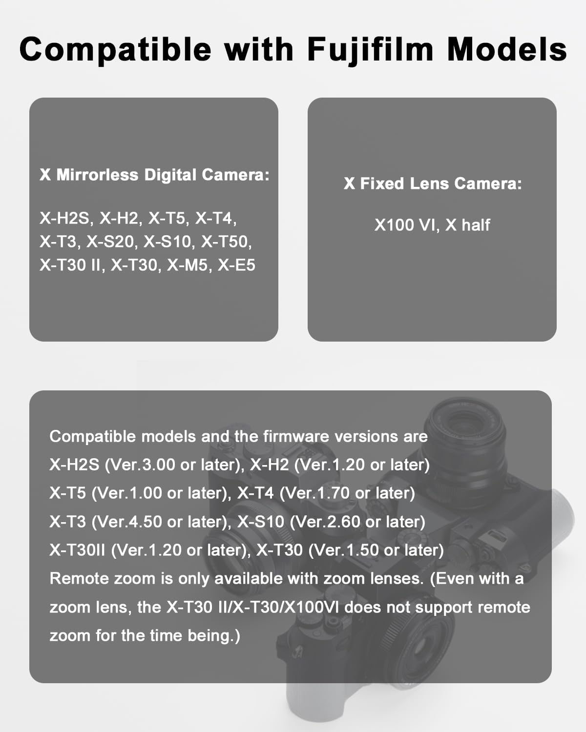 - Compatible with multiple models: Our wireless remote control for for Fujifilm X-H2S, X-H2X, X-T5, X-T4, X-T3, X-S20, X-S10, X-T50, X-T30 II, X-T30, X-M5, X-E5, X100 VI, X half. Please put both the camera and the remote into pairing mode to get it connected, and compatible with the above model.