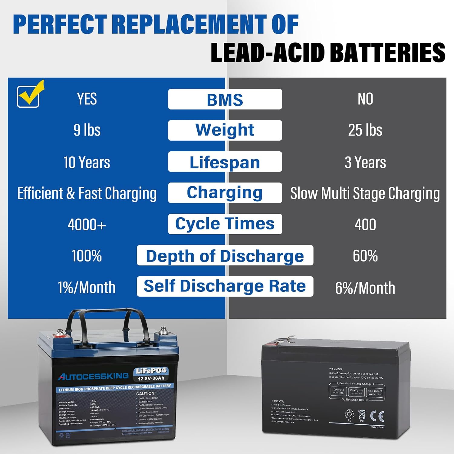 - β BUILT TO LAST - Our 12V 36Ah LiFePO4 batteries are designed to deliver over 2000 deep cycles at 100% DOD, with a lifespan of 10+ years. These batteries provide consistent power across all 36 amp-hours, thanks to their flat voltage curve. Unlike traditional SLA batteries, the power output remains steady as the battery discharges, avoiding the dramatic voltage drop that is common with lead-acid batteries. With a full 36Ah capacity, this battery ensures enough reliable power, making it perfect for applications such as camping, solar, boat, or backup power.