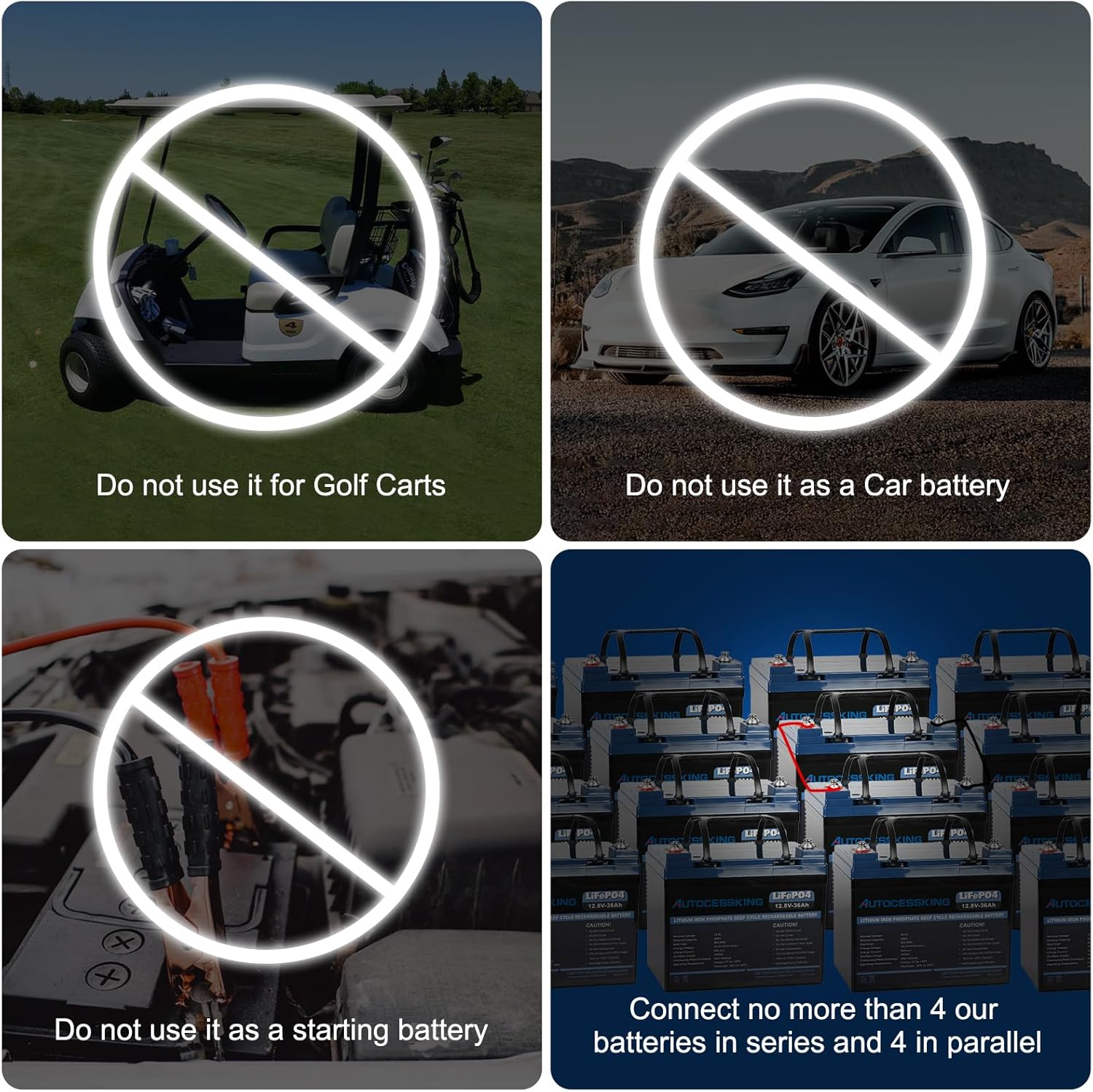 - β Autocessking 12V lithium battery is designed for energy storage purpose only. We do not recommend using it as a starting battery for cars or golf carts.