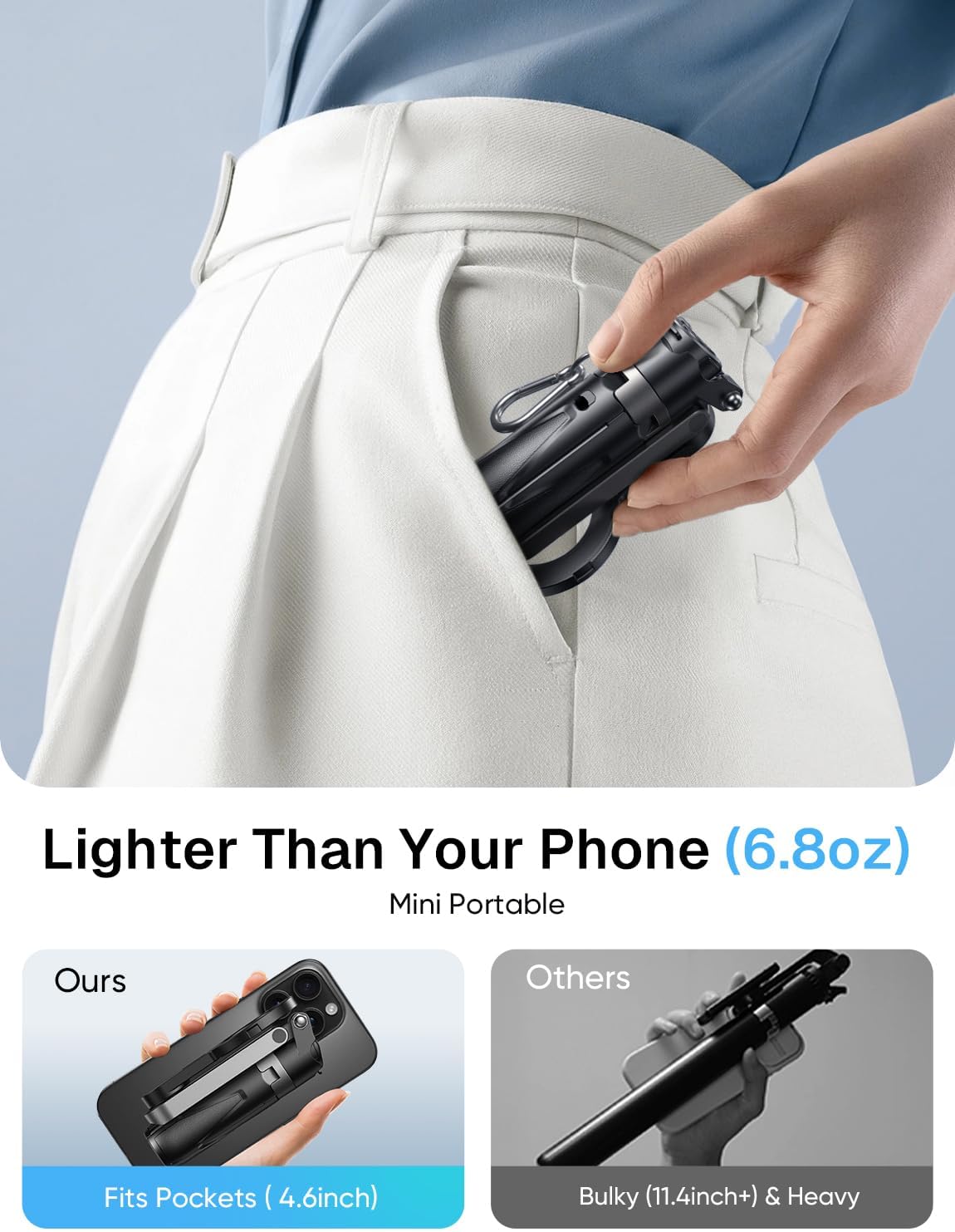 - 【Lightweight & Pocket Size】Weigt only 137g and folding up to the size of your palm, this compact selfie stick is incredibly lightweight It reduces the weight of your backpack and takes up minimal space for travel photography. Simply slip it into your pocket without any hassle. And convenient to carry around wherever you go. The compact and lightweight design and lanyard allow you to easily hang it on your hand, backpack, belt, and other places. Accompany you anywhere and anytime.