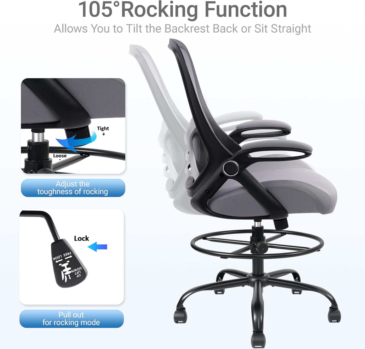 HYLONE 400lbs Heavy Duty Drafting Chair 5" Thickened Seat Office Chair with Flip-Up Armrests Tall Ergonomic Computer Chair with Lumbar Support and Adjustable Footrest Ring Standing Desk Chair(Grey)