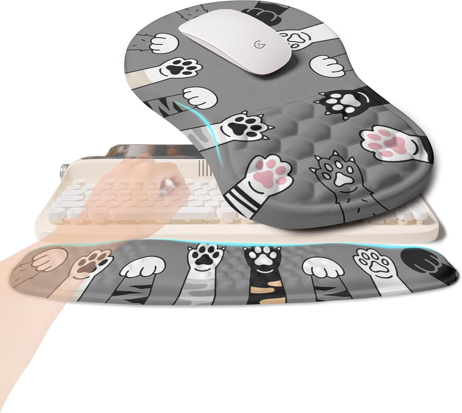 2-in-1 Ergonomic Set, Wave Rise Keyboard Wrist Rest and Massage Bulge Slope Mouse Pad Wrist Support, Cushion Memory Foam Integrated to Relieve Wrist Pain, Cute Cat Paws