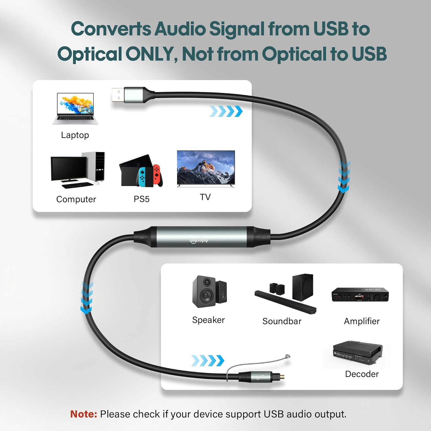 - Kind Reminder: Only supports one-way transmission from USB-A to SPDIF, does not support reverse (SPDIF → USB-A) ---- Volume control via computer is ineffective; please adjust volume through the optical receiver (e.g., amplifier or speaker) ---- Some devices may require confirmation whether the USB port supports audio output