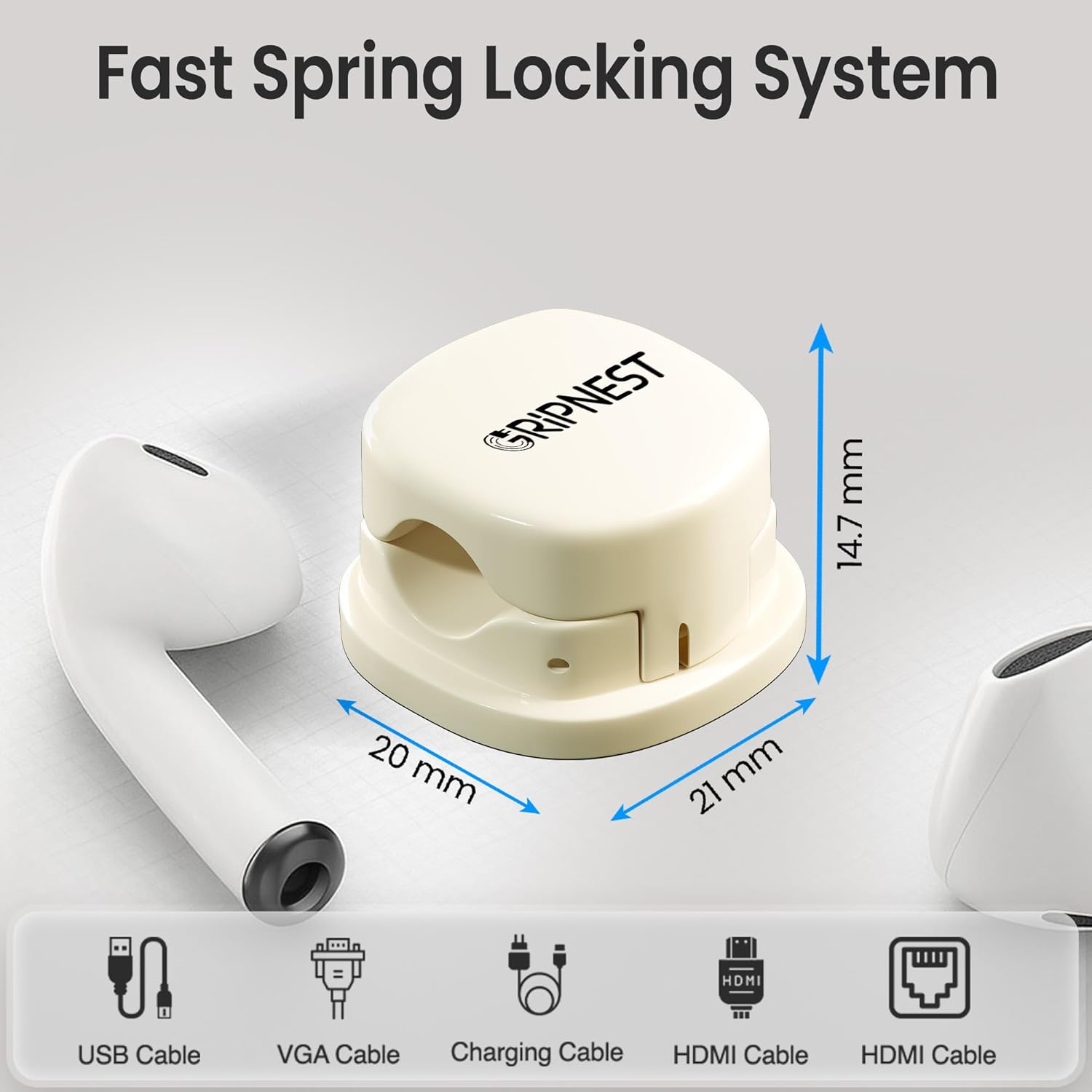 - Cable Holder with Spring Lock: This sleek white wire clips features a 360° rotating base and spring loaded grip that locks cords in place. Great for desks or used as a phone cord holder on your nightstand for quick access.