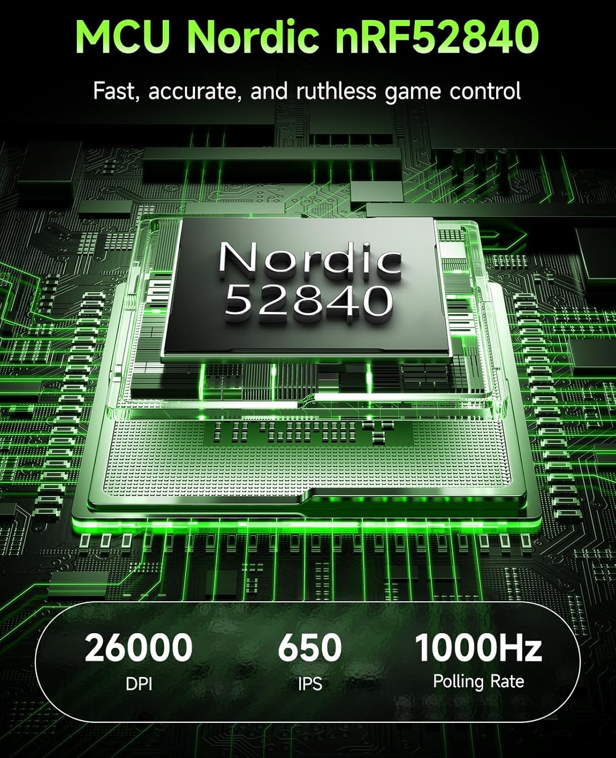 - PRO-GRADE PAW 3395 SENSOR + NORDIC CHIP β Up to 26,000 DPI, 650 IPS, 1000Hz polling. Lightning-fast tracking and ultra-low latency powered by the reliable NRF52840 chipset.