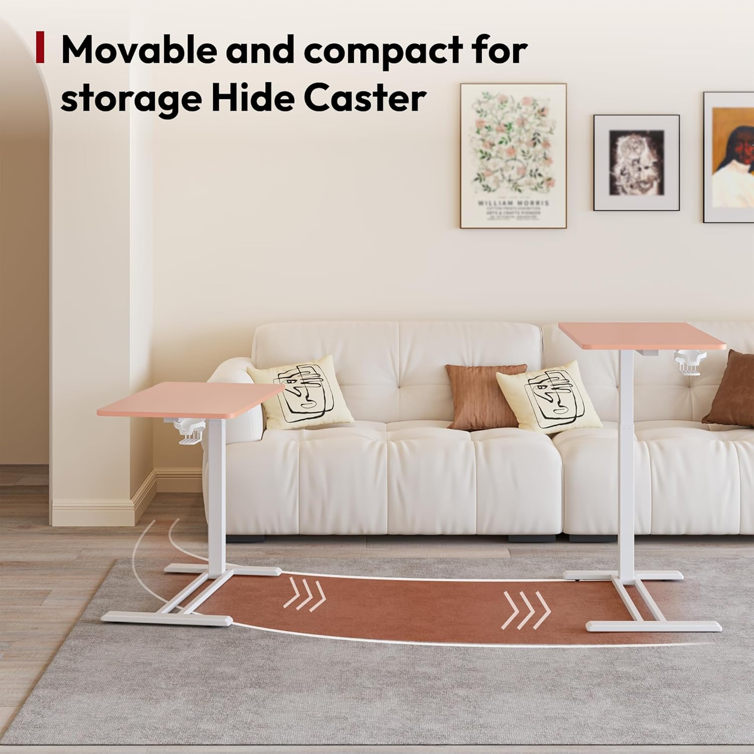 SANODESK Medical Adjustable Overbed Bedside Table with Hidden Casters, Pneumatic Mobile Laptop Computer Standing Desk Cart with Tray, Hospital and Home Use(31.5" W x 17.7" D, Pink)