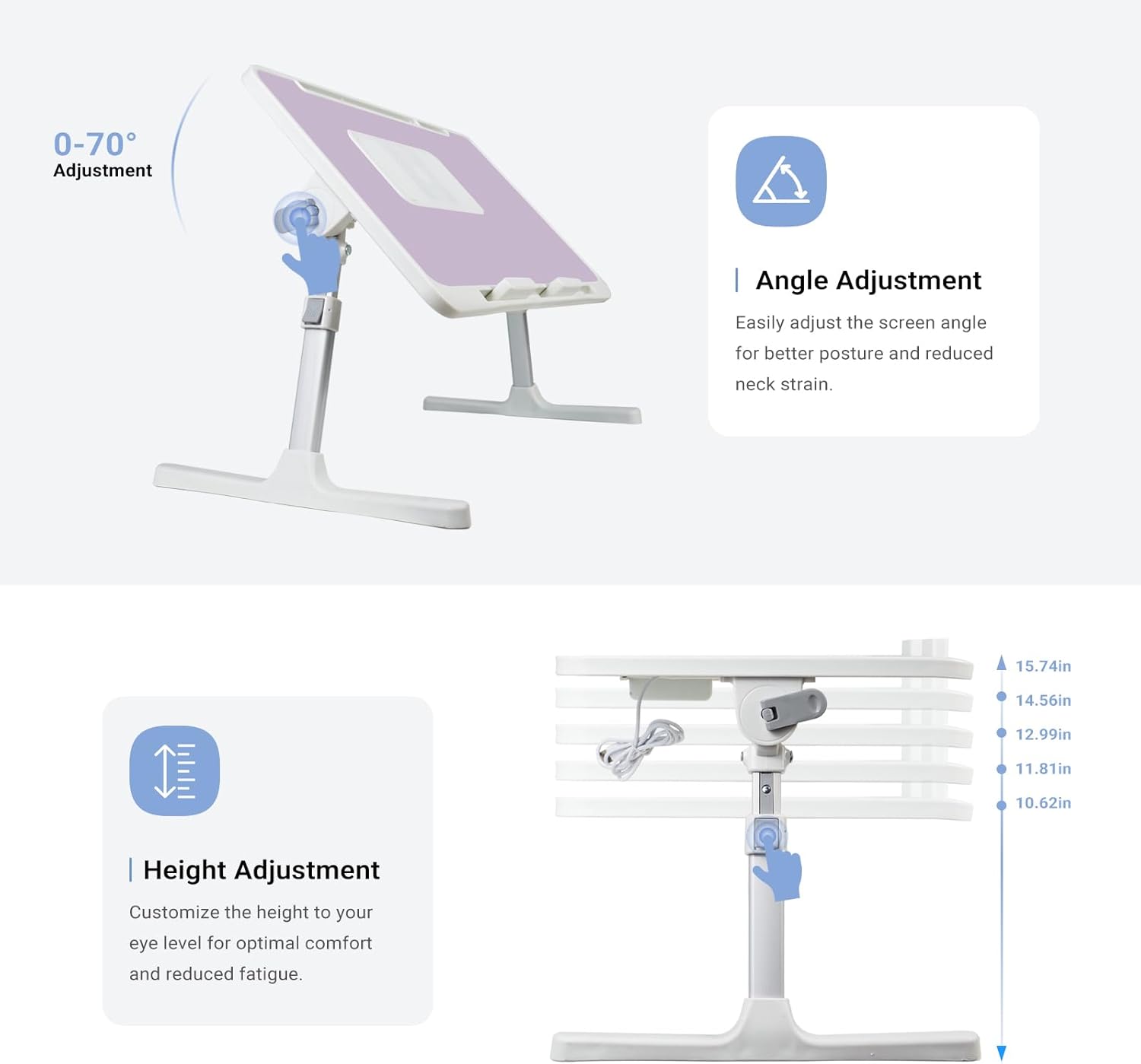 - 【📐Adjustable Size for Optimal Use】Measuring 15.74 x 23.62 inches(60*40cm), this height-adjustable laptop table adapts from 10.62" to 15.74"(27-40cm), thanks to its convenient auto-lock buttons. Its foldable legs ensure easy storage, and the 24.4 inches leg clearance offers comfortable movement. The tabletop's angle is adjustable up to 70°, promoting better posture and reducing strain.