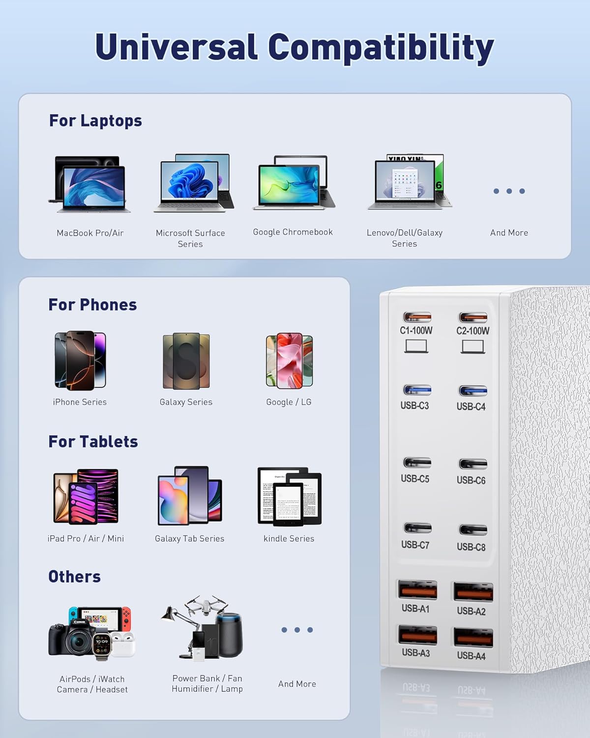 - ăUniversal CompatibilityăOur USB C charging station is equipped with 2*100W and 2*65W fast charging ports, which can charge 3 or more laptops at the same time. Compatible with smartphones, tablets and laptops, suitable for MacBook Pro/Air, Dell XPS, iPad Pro, iPhone 16/16 Pro Max, iPhone 15 Pro Max, iPhone 14/13 Pro/12 Pro Max, iWatch, AirPods, Surface Pro, Galaxy S24 Ultra, Switch, Steam Deck, Google Pixel and many other devices.