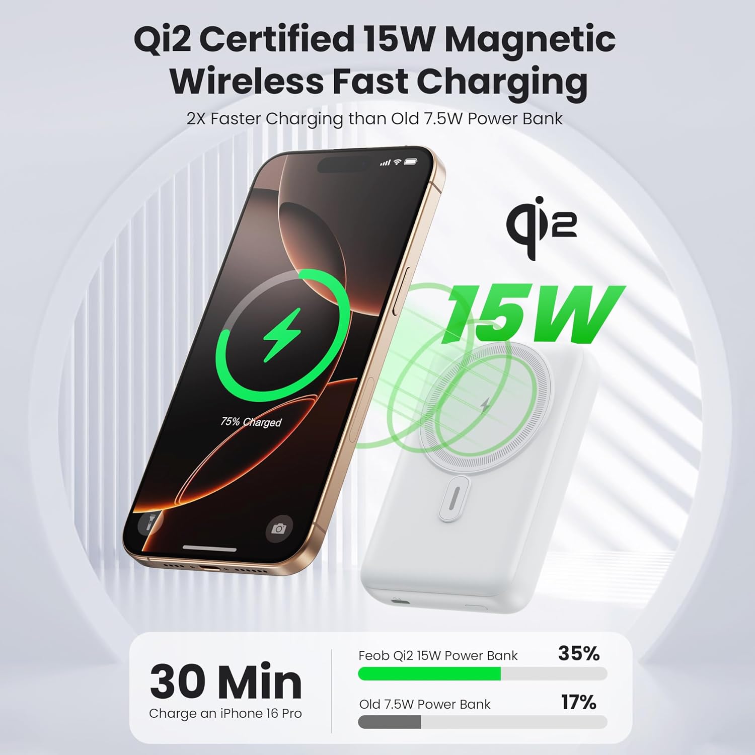 - 【Newest Qi2-Certified 15W Wireless Charging】 Solves the industry's slow wireless magnetic charging issue, our N2 magnetic power bank can powering your iPhone 16 up to 40% in just 25 minutes — nearly as fast as wired charging.