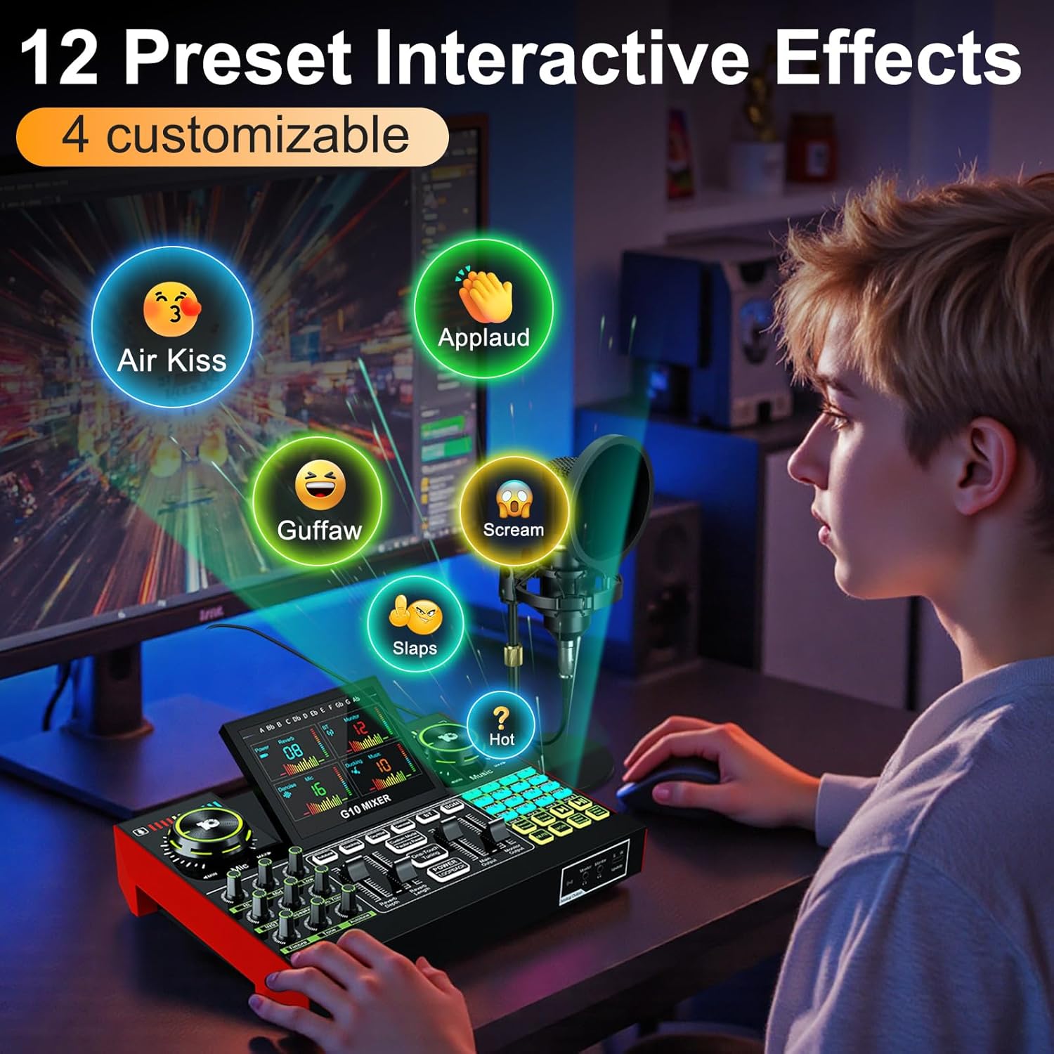 - 【Born for Live Streaming】This podcast mixer features 12 built-in scene effects and includes a noise reduction function. It also allows adjustment of bass, treble, reverb, and 12 levels of pitch. Additionally, it supports 4 types of voice changing—male, female, baby, and deep uncle voice—making your streaming content more fun and engaging.