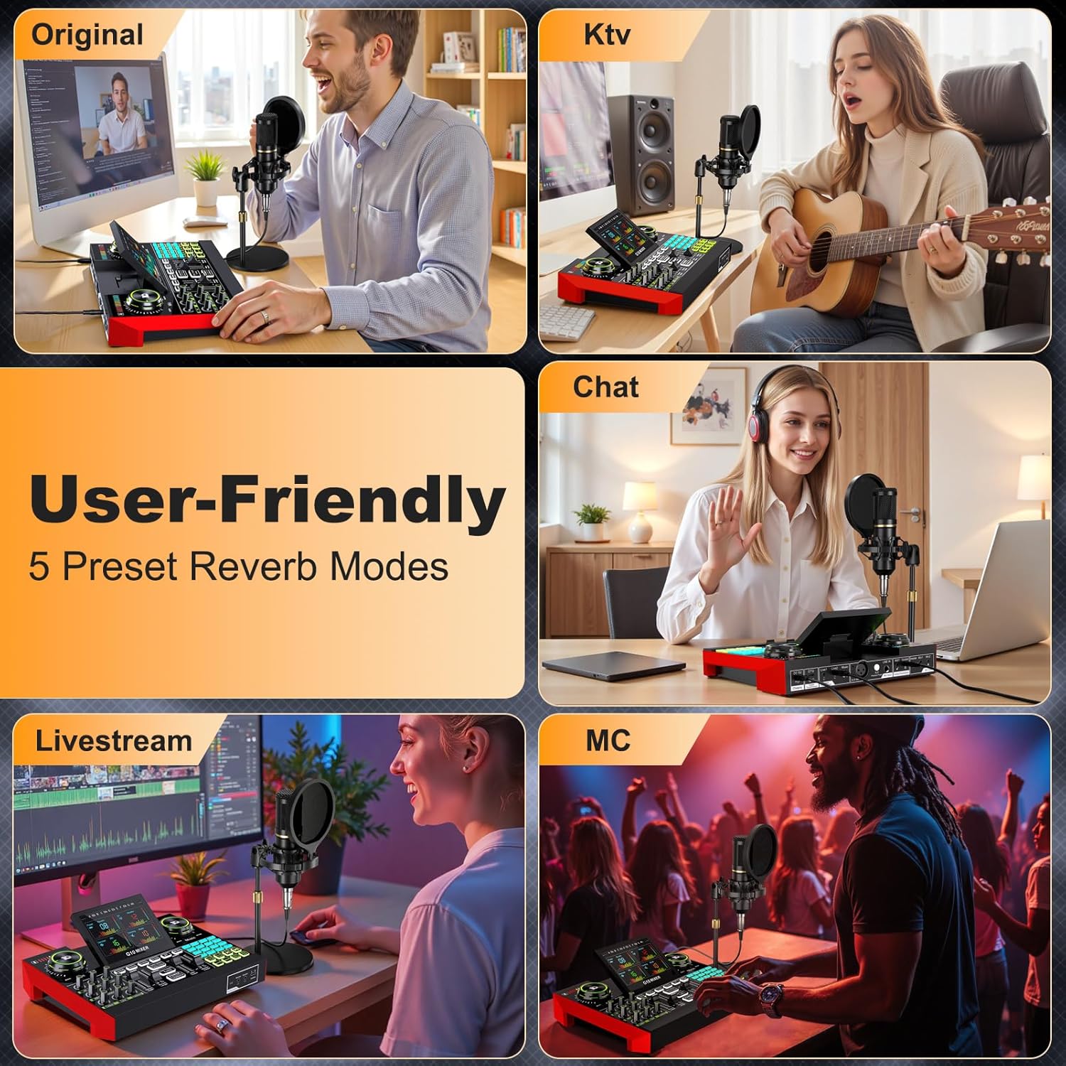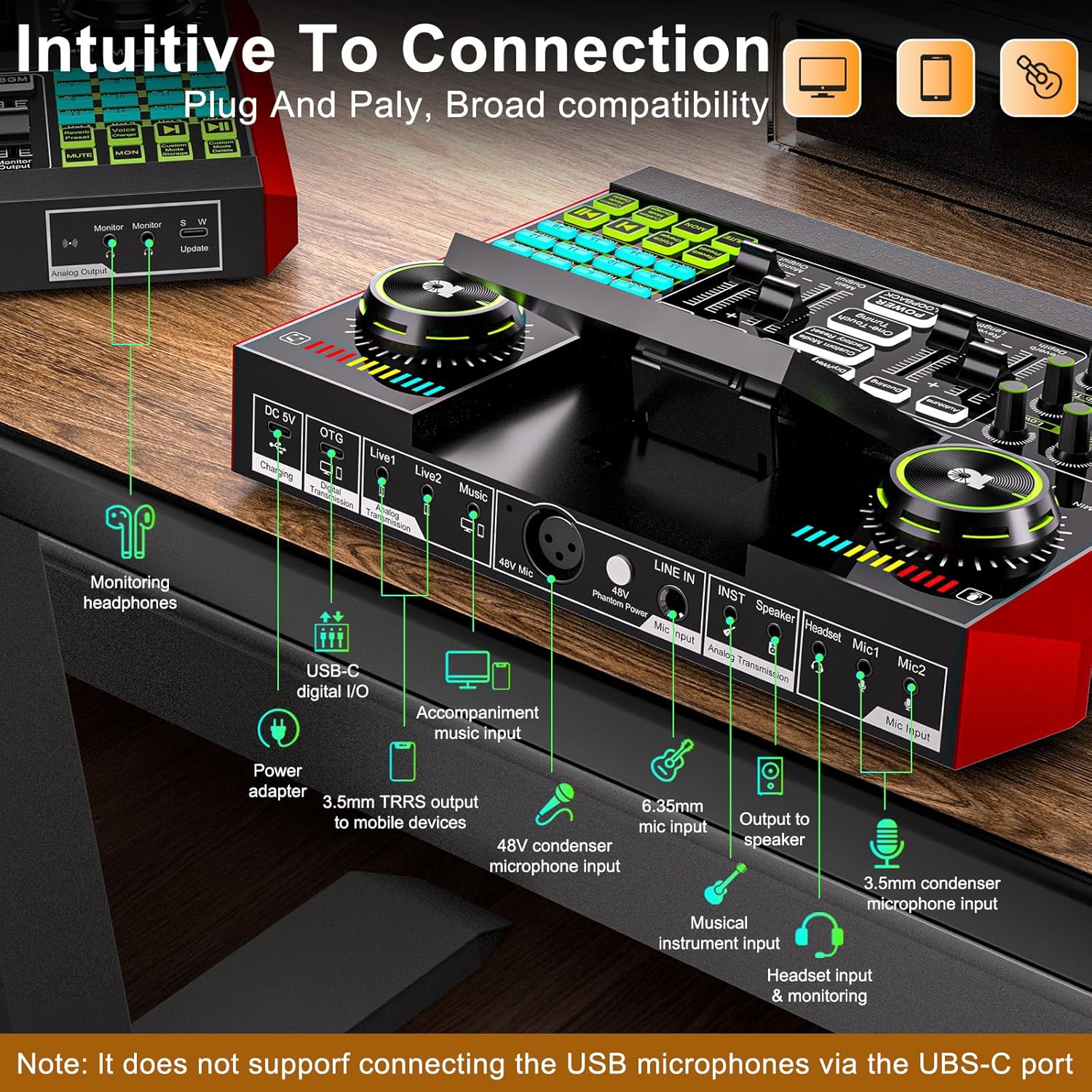 - 【Built-in Noise Reduction Function】Using the noise reduction function of this soundboard, whether you are live streaming or recording short videos, it keeps your voice always relatively clear and eliminates some environmental sound interference.