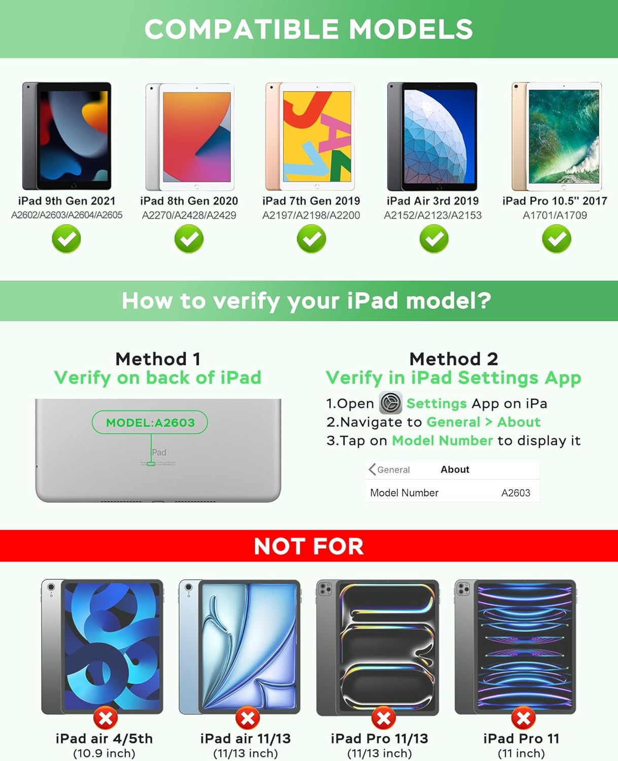 - 【2 in 1 Keyboard Case for 10.2"】No Pen included! The keyboard cover is designed for iPad 10.2" 9th Gen 2021 (Model number: A2602/A2603/ A2604/ A2605),8th Gen 2020 (A2430/A2270/ A2428/ A2429),7th Gen 2019 (A2197/A2198/A2200).It's Not compatible with any other devices. Please check the model number of your iPad back bottom.