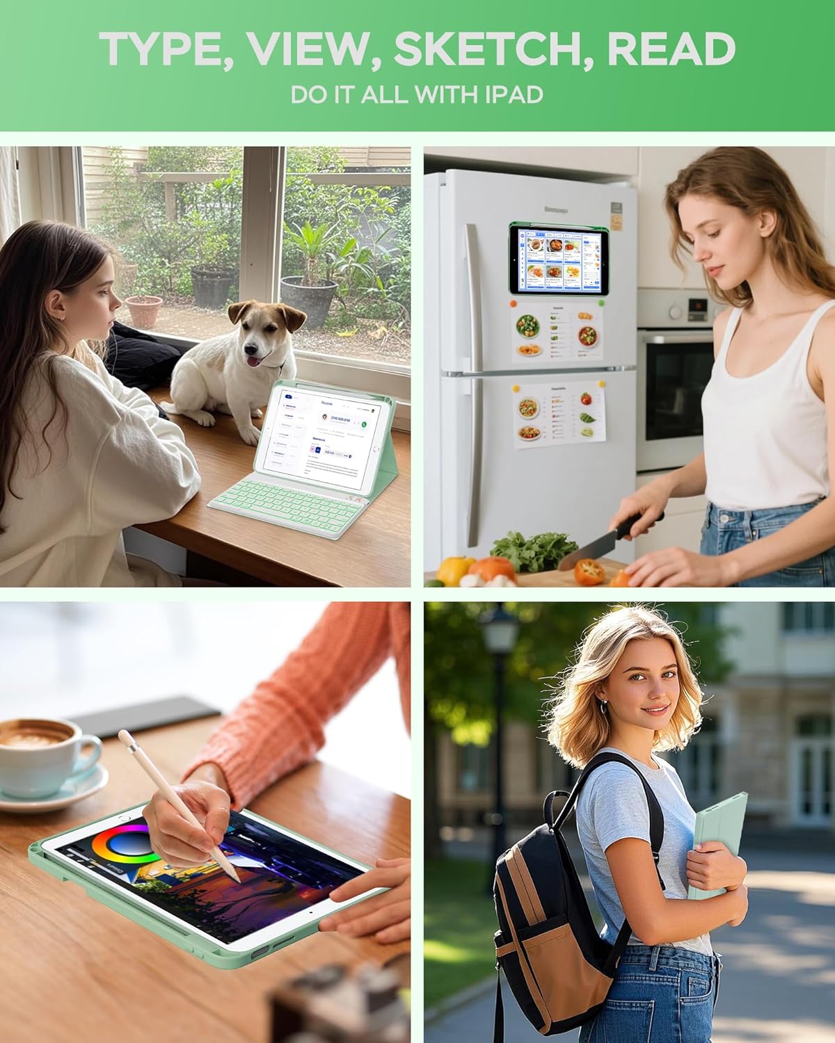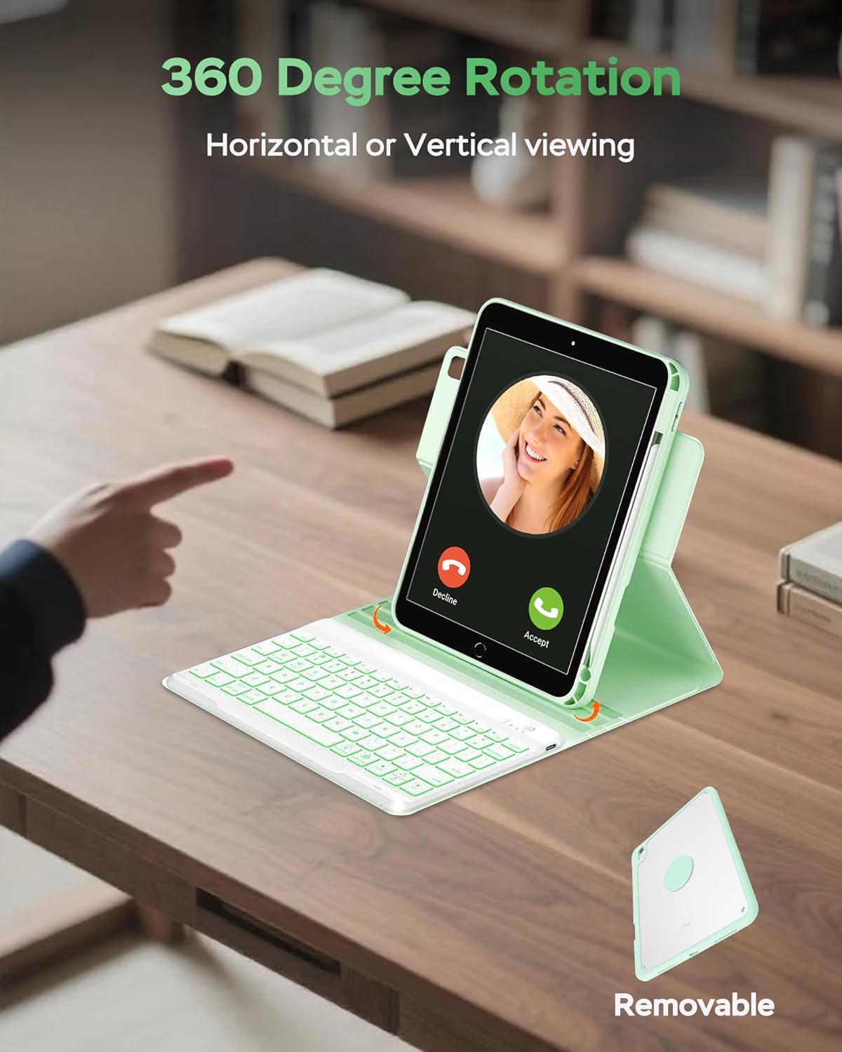 Keyboard Case for iPad 7th/8th/9th Generation 10.2'' 2019/2020/2021, 360° Rotatable Magnetic Keyboard Case with Pencil Holder Groove, 7 Color Backlit Wireless Detachable Keyboard (Green)
