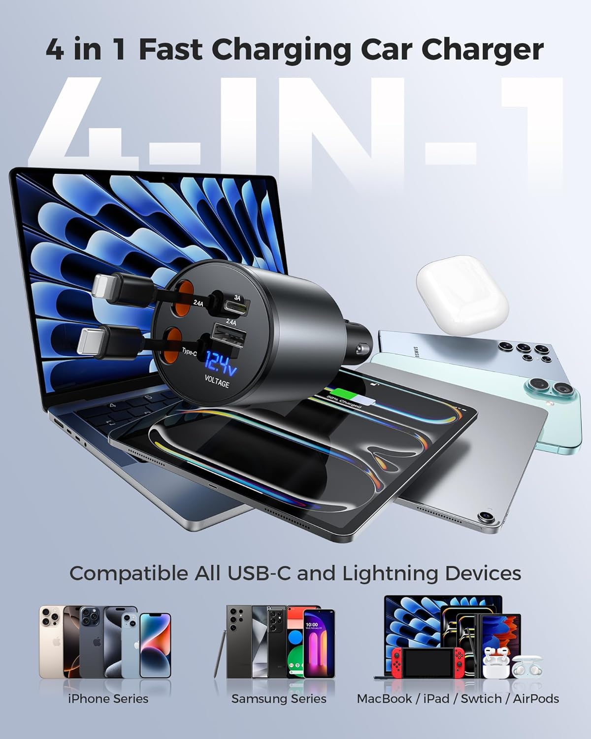 - 4 in 1 Super Fast Car Charger: This retractable car phone charger with a total power output of 120W. Featuring a PD fast-charging 100W Type-C port, a 20W L port, a 5V/3A USB-C port, and a 5V/2.4A USB-A port, you can charge up to four devices simultaneously. Our PD 100W Type-C port can charge MacBook Pro from 0 to 50% in just 35 minutes, ensuring all your gadgets stay powered wherever you go